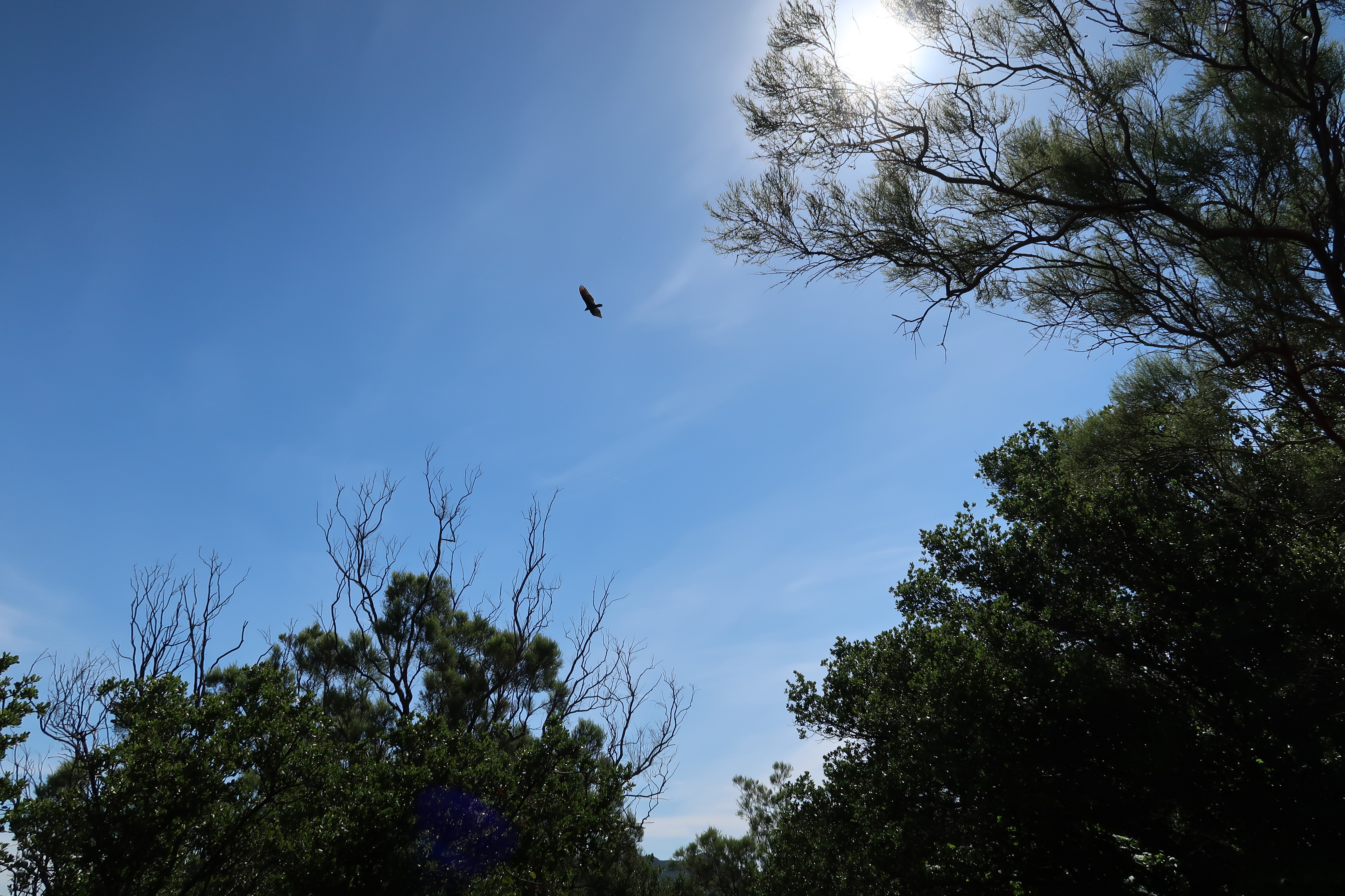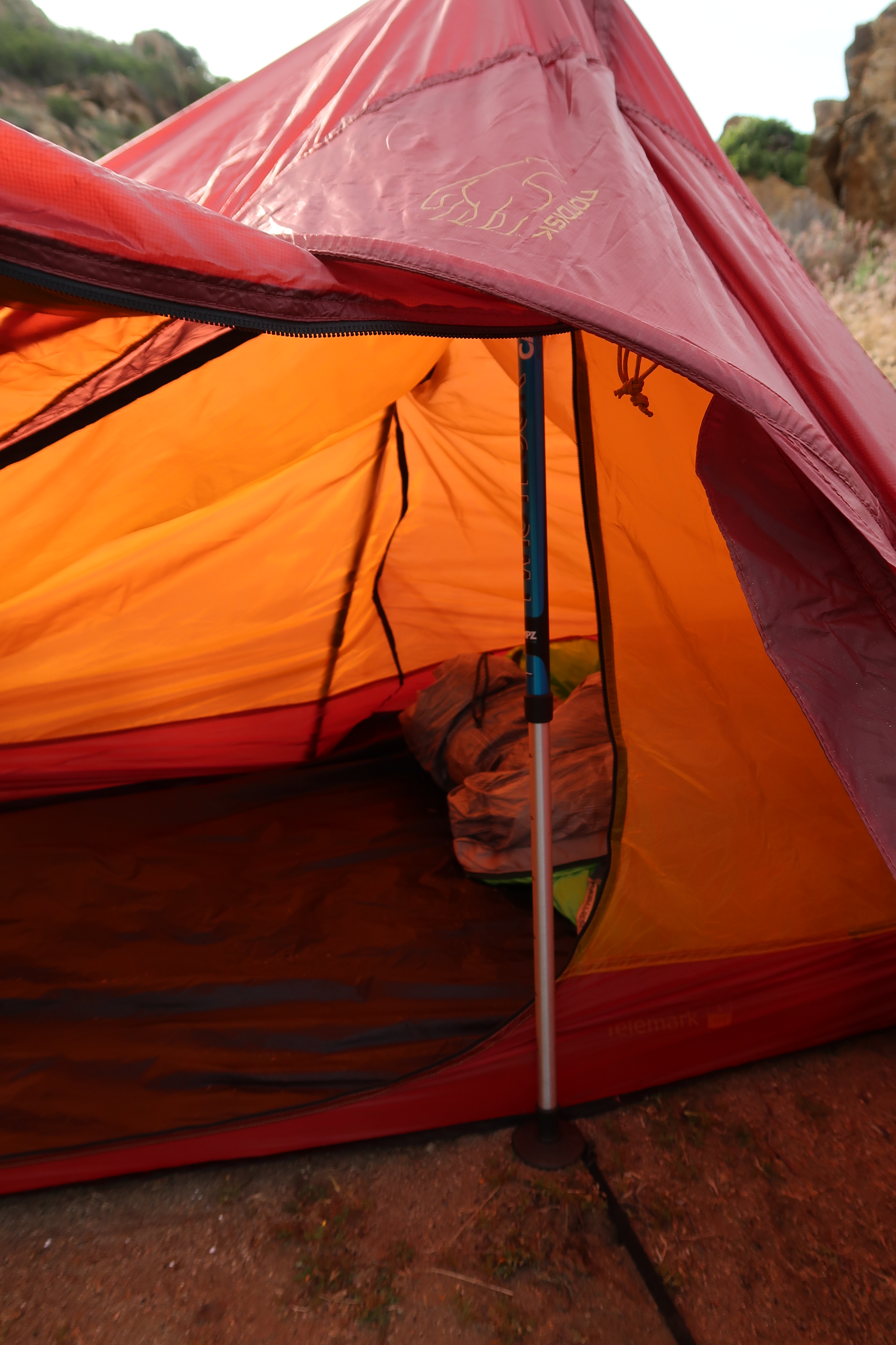 Trotz all den tollen Ereignissen, gab es auch Probleme. So ist zum Beispiel beim Zeltaufbau ein Segment meiner Zeltstange gebrochen. Ich hoffe, das wird wieder (geklebt mit „Superkleber“). Ich warte bis morgen wegen trocknen. Ich habe mir so notdürftig und erfinderisch, wie ich halt sein kann, meine Treckingstöcke genommen und unter das Zelt als Stütze geschoben. Das scheint gerade zu halten. Aber es ist auch gerade so gut wie kein Wind hier. Dann bin ich noch auf eine herausragende spitze Wurzel getreten, die mir direkt ein kleines Loch in den Fuß gerammt hat. Aber halb so wild. Desinfiziert und abgeklebt. Fertig.