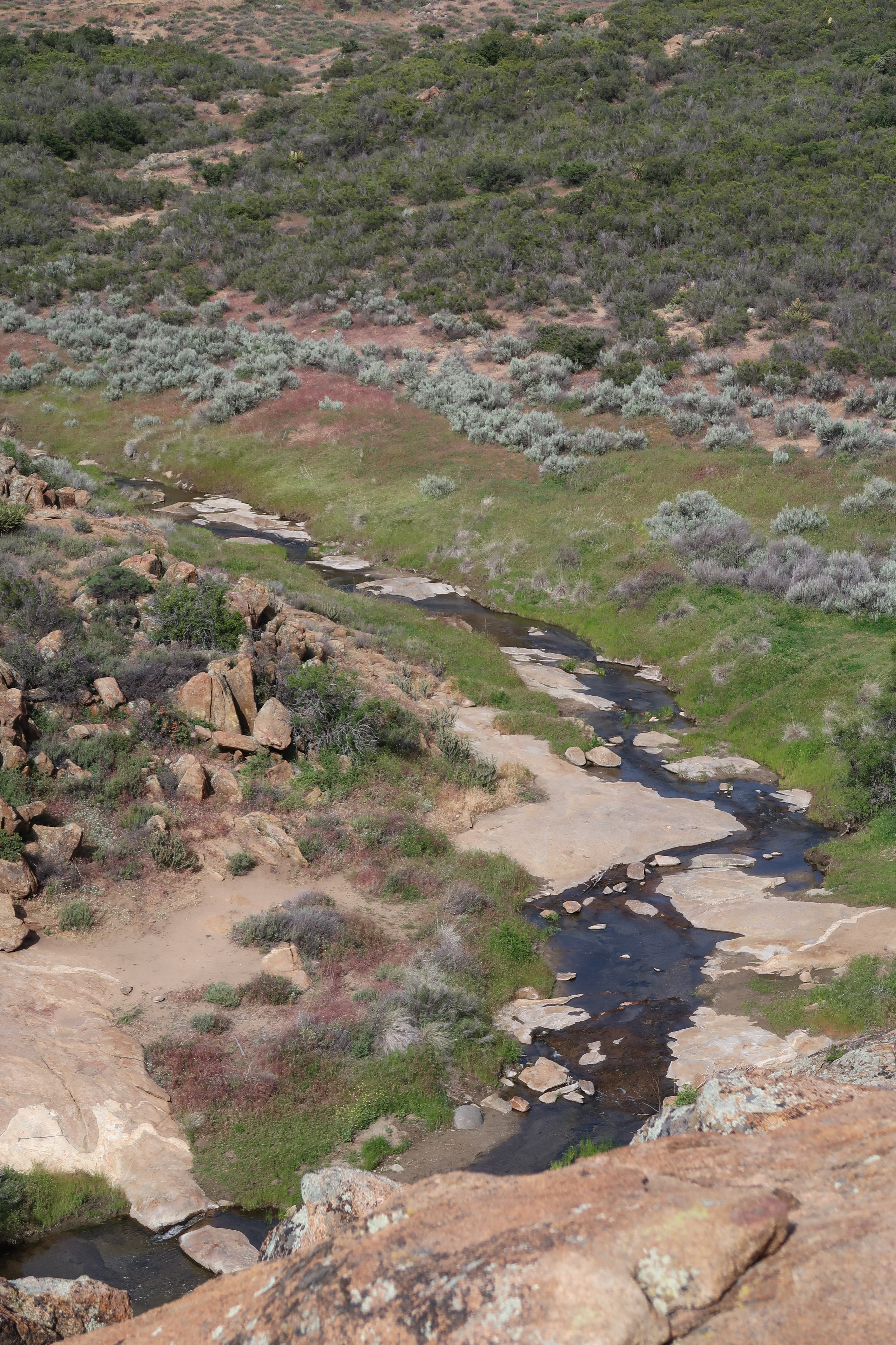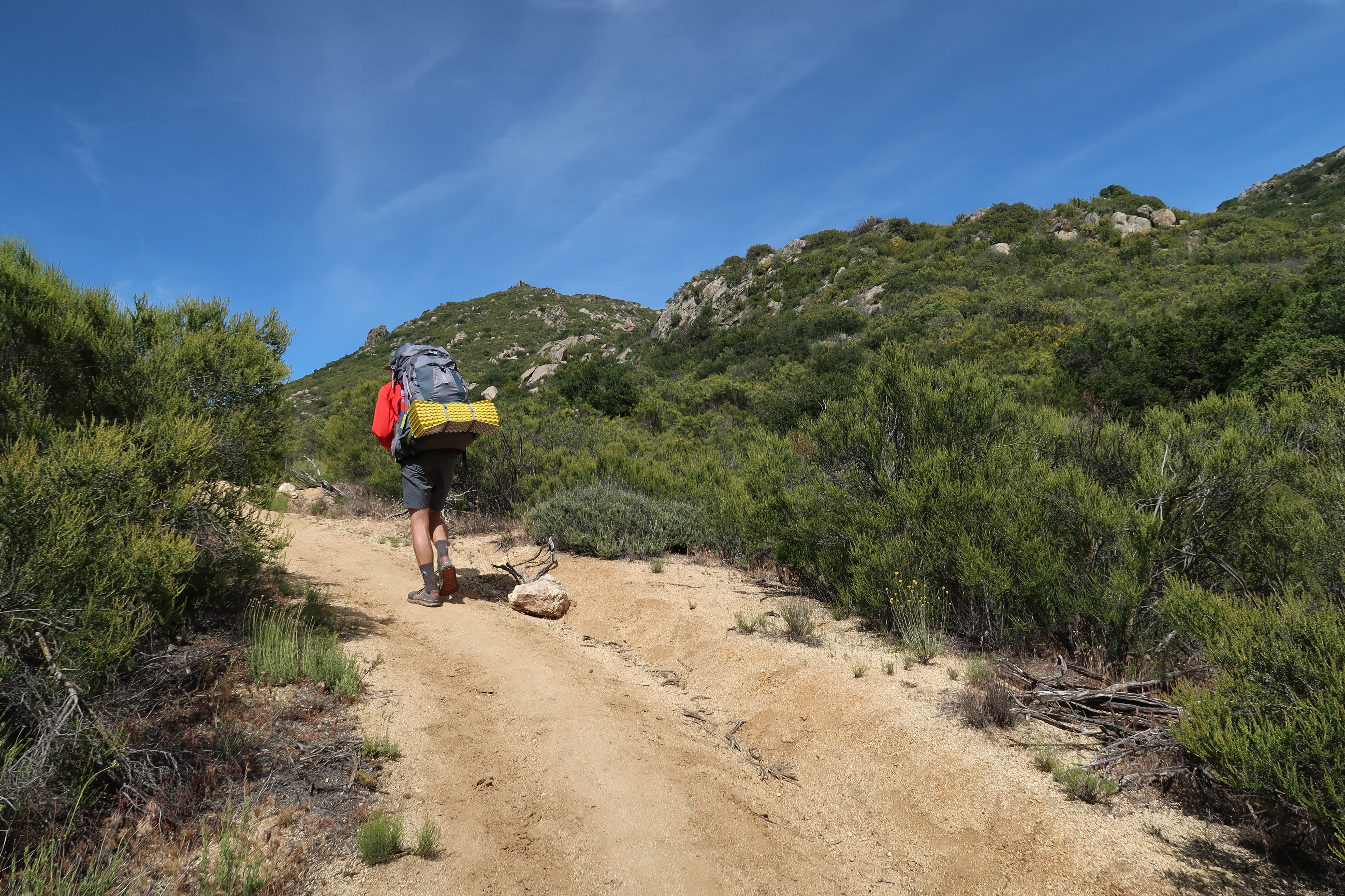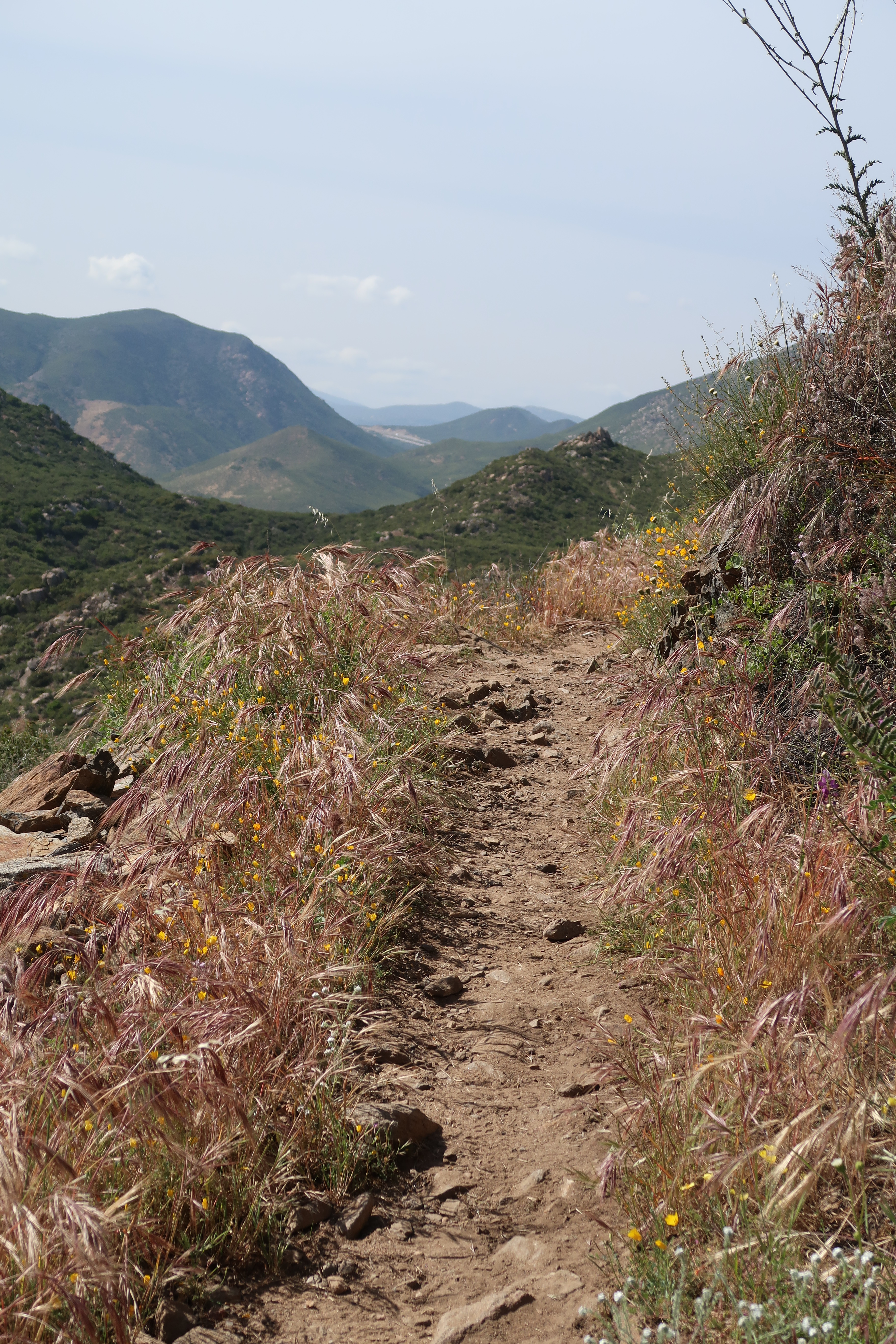Ich setzte meinen Weg fort und die Sonne fing an richtig krass zu brennen. Es war heute so heiß, dass ich mein Shirt komplett durchnässt habe (wie frisch aus der Wäsche, nur nicht so duftend 😉 ) Zum Glück traf ich auf Emma, einer Frau aus Frankreich. Da in uns beiden das grüne Blut fließt, hatten wir direkt ein paar Gesprächsthemen. Das lenkte ein wenig von der Sonne ab. Da ich einen mega Sonnenbrand an den Händen und Armen bekommen habe, habe ich mir trotz der Hitze eine lange, dünne und weiße Sportjacke angezogen. Die hat wenigstens einen Teil der Strahlung reflektiert. Wir liefen durch Gegenden, die den Anschein erweckten, in manchen Jahren extrem trocken zu sein. In diesem Jahr hat es jedoch deutlich mehr geregnet als sonst (Südkalifornien hat normalerweise sehr selten Regen). Dadurch sind die Pflanzen sehr grün geworden.