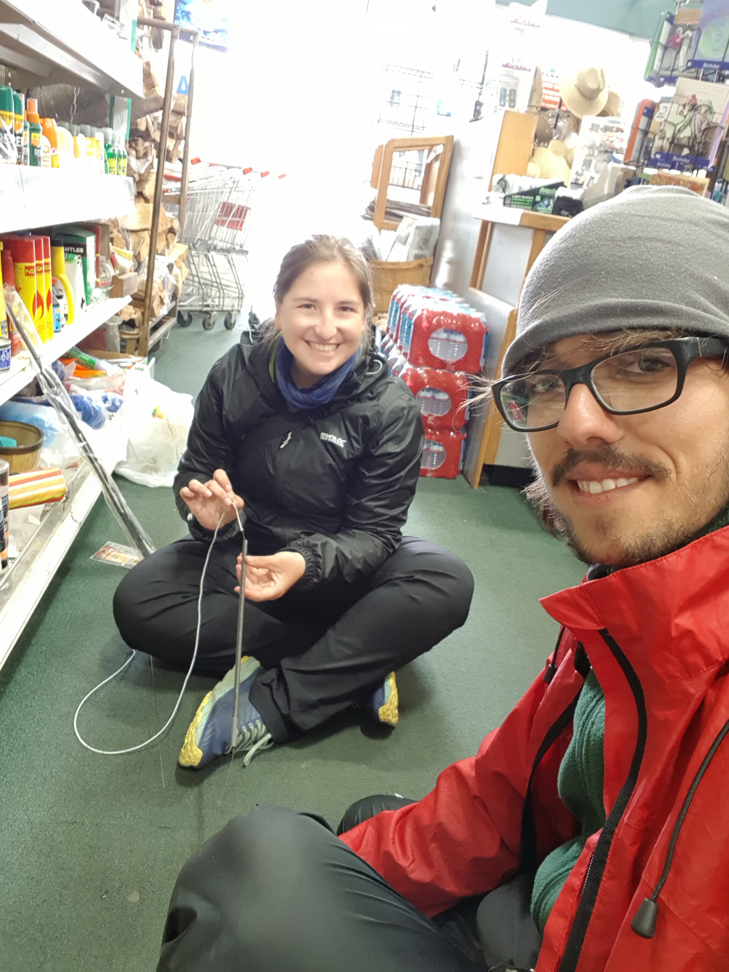 Trotzdem noch eine gute Nachricht: ich habe es wohl geschafft, meine Zeltstange, die seit Tagen kaputt ist, notdürftig mit zwei Metallverbindungen eines anderen Zelt-Reparatursets zu reparieren!! Das Ganze hat wohl so eine gute Stunde gedauert, aber wir haben es schließlich dennoch geschafft. Wir hockten da auf dem Boden eines Supermarkts und versuchten verzweifelt den dämlichen Strick innerhalb der Stange durchzufädeln. Letztendlich gelang es uns, nach gefühlten 100 Versuchen den Strick mithilfe eines Drahtes (den wir in den Strick hineingesteckt haben) durchzufädeln. Den ersten Stresstest hat die Stange glücklicherweise im Hotelzimmer überlebt! Hoffentlich bleibt das so, sonst mach ich halt Cowboycamping oder wie das heißt, also einfach ohne Zelt in der Natur kampieren. Klingt aber nicht so lustig, meiner Meinung nach – nicht bei den Temperaturen hier oben 🙂