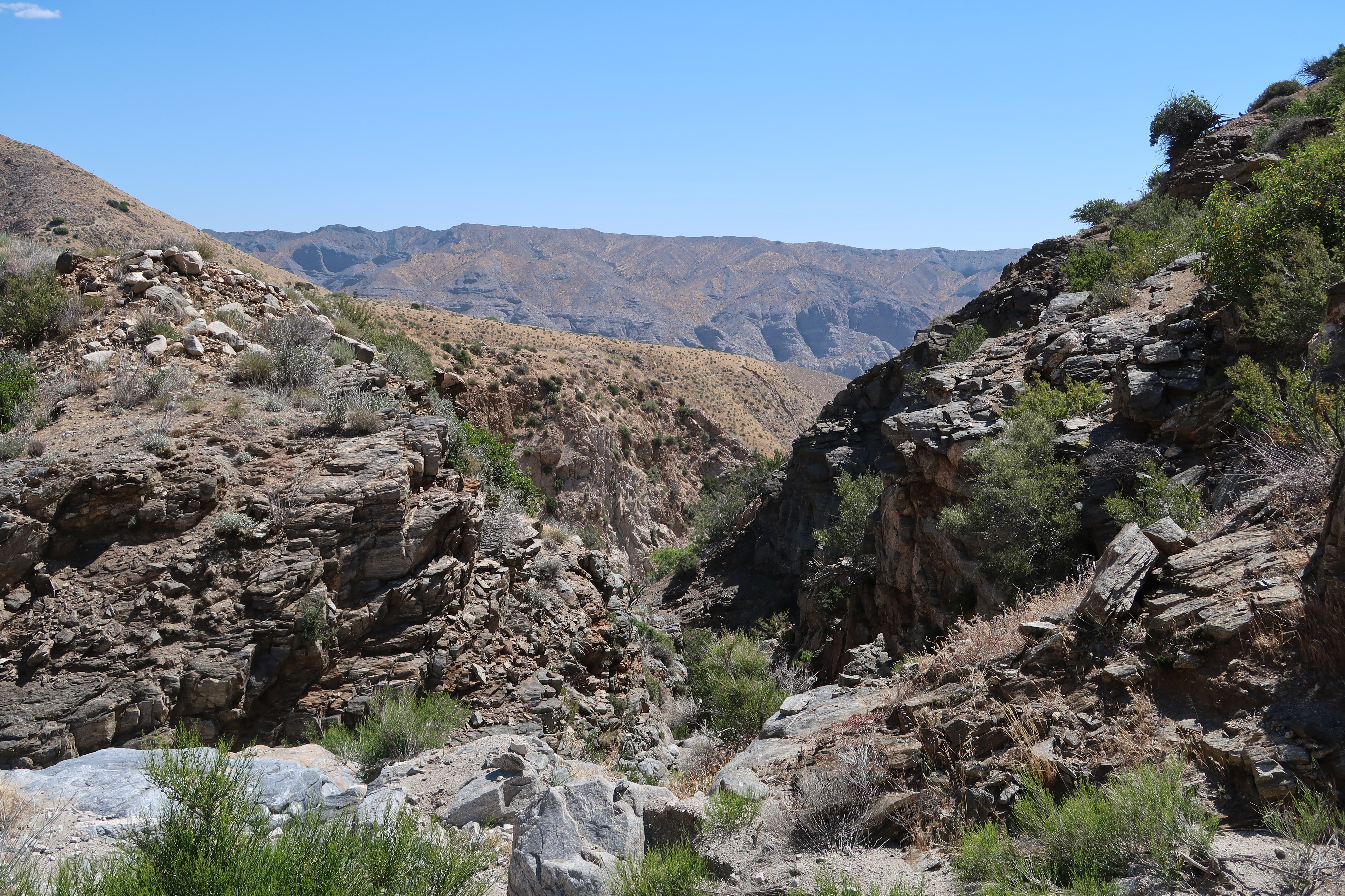 Bereits früh um acht Uhr brannte die Sonne bereits so erbarmungslos auf uns herab, dass der Schweiß an mir nur so herabtropfte. Kein Wind. Ich fühlte mich, als ginge ich mit einem 20 Kilogramm schweren Rucksack durch die Sauna. Bergauf. Es wurde so schlimm, dass wir aller paar hundert Meter stoppen mussten und uns in den Schatten kleiner Büsche warfen. Die Hitze war unerträglich.