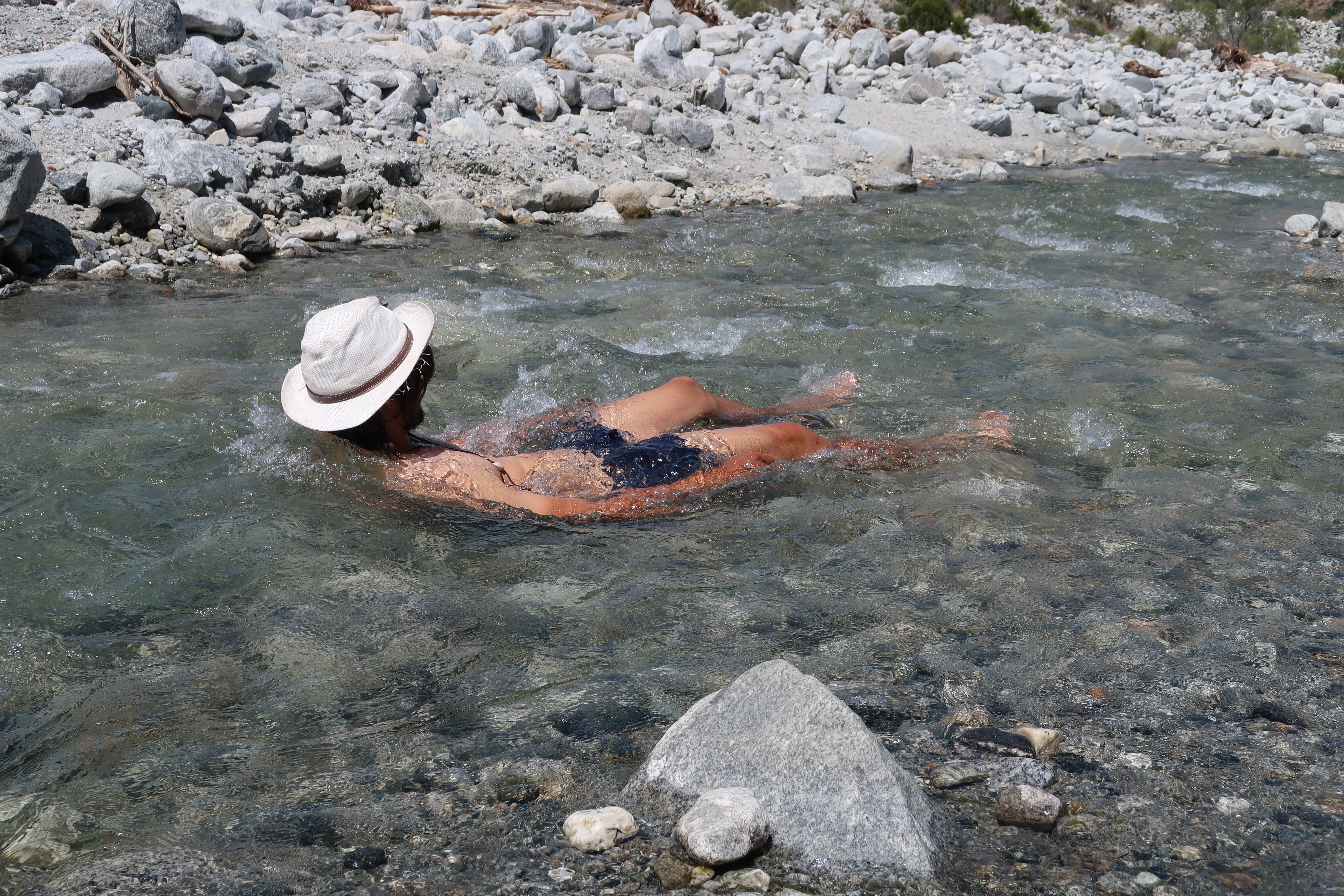 Und dann endlich: Wasser! Nach einem kurzen Aufenthalt im Schatten, sprang ich in den Fluss. Es war unbeschreiblich schön. Der Strom fühlte sich unglaublich gut an meinem Rücken an. So saß ich dann eine Weile im Wasser und habe einfach nur genossen, während der kühle Fluss um meinen Körper spülte.