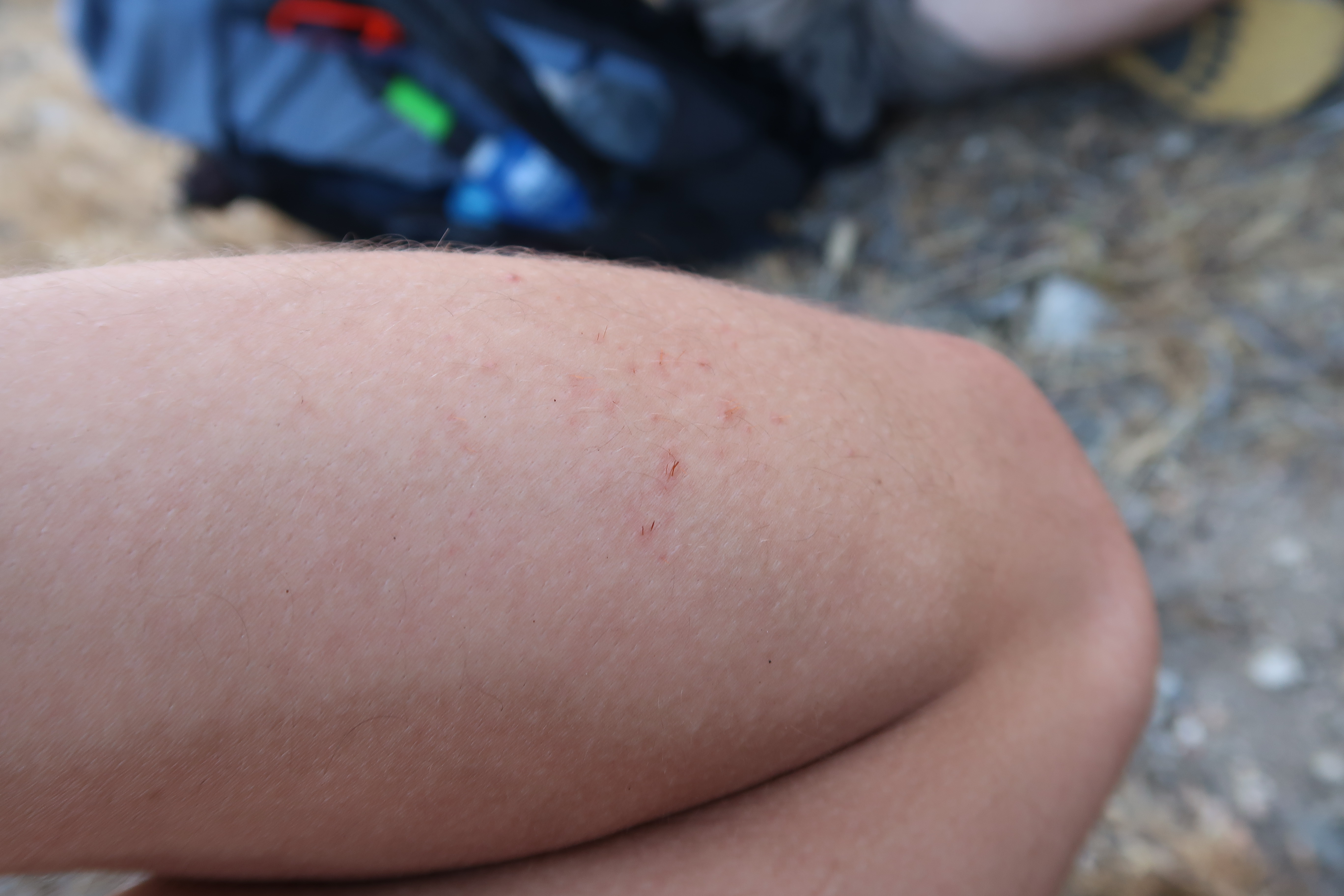 Irgendwie habe ich es dann auch noch geschafft meinen Unterarm voll in einen Kaktus zu stoßen, den ich übersehen hatte, als ich mich wegen einer Verschnaufpause hinsetzen musste. Wenn ihr jetzt denkt, ach die paar Stacheln, das ist nicht weiter schlimm: doch, ist es. Es war eines dieser Gewächse, welche mit feinsten Stacheln, dünner noch als Haare, besetzt sind. Und so hatte ich hunderte kleiner Nadeln in meinem Arm stecken. Ich und Arrow brauchten zusammen etwa eine halbe Stunde, um mich in einer schmerzhaften Prozedur weitestgehend von den Dingern zu befreien. Auf dem Bild ist das kaum zu erkennen, man kann jedoch die Irritation meiner Haut sehen. Vergleichbar sind diese Stacheln übrigens mit denen von einer Kaktusfeige. Nur irgendwie schlimmer.