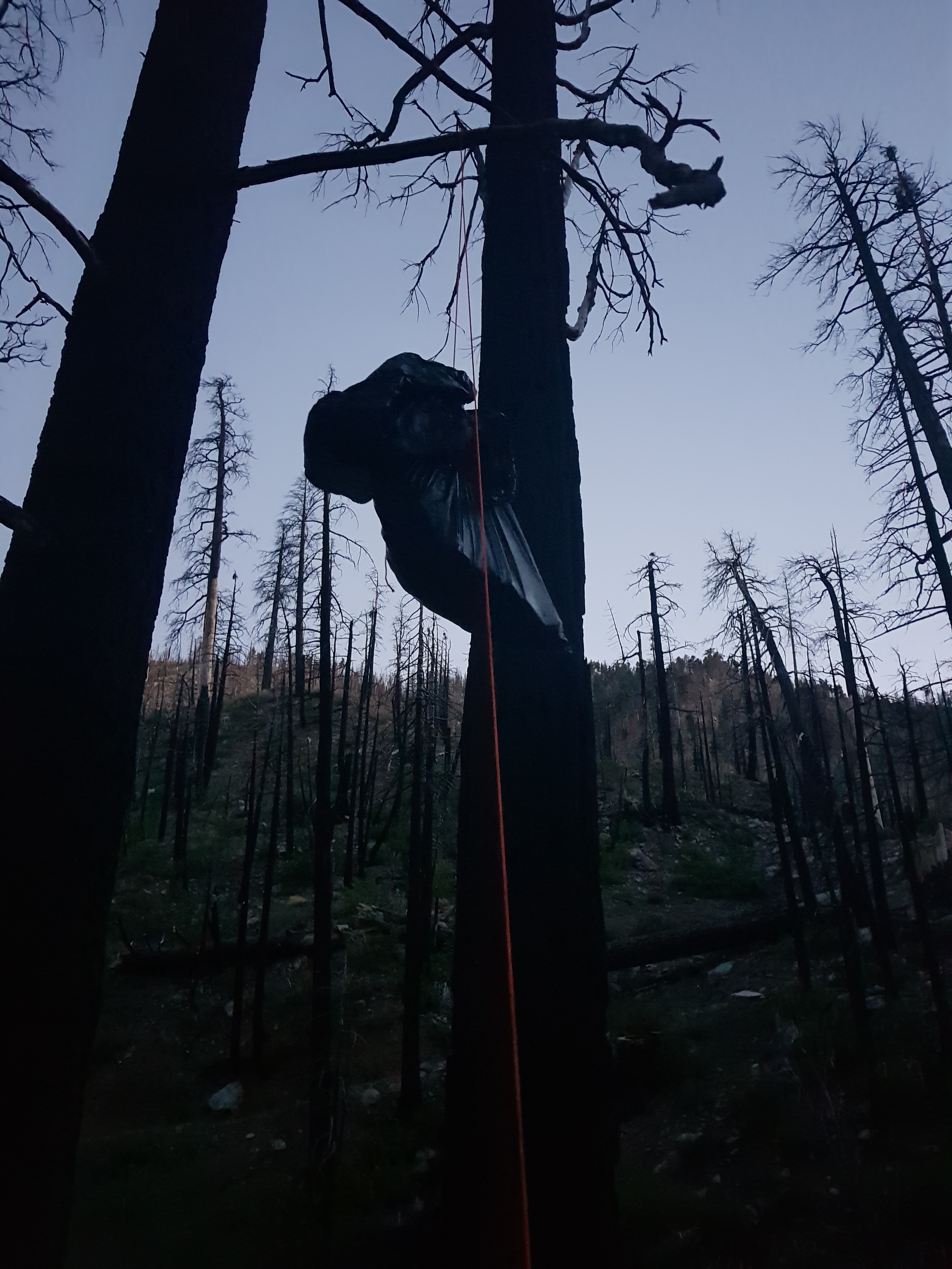 Da es hier angeblich mehr Bären geben solle, als irgendwo sonst auf dem PCT (vom Hörensagen), habe ich mein Essen und alles, was irgendwie riechen konnte, in einen Müllsack gestopft und mit einem Seil auf einen Baum hochgezogen. Sicher ist sicher, ich möchte keinen Bären nachts zum Kuscheln, auch wenn es hier oben kalt werden kann 😀