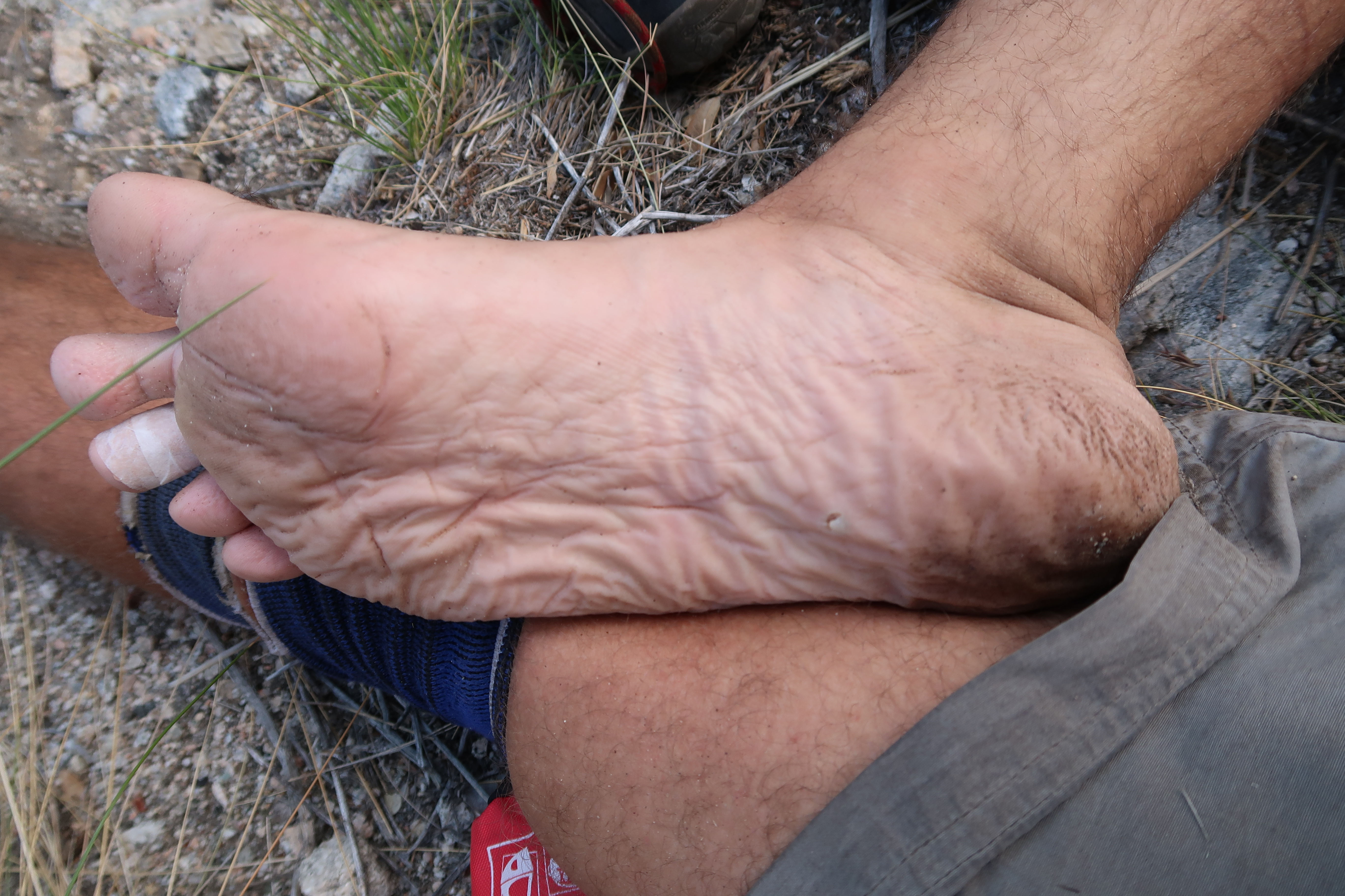 Ich machte Rast am Wegesrand, weil ich Schmerzen an den Zehen hatte und mal nachschauen wollte. Und was ich dann sah, jagte mir zunächst einen echt großen Schrecken ein. Da ich öfter als ich zählen konnte durch den Fluss gestiefelt bin, sind meine Schuhe samt Socken natürlich komplett durchgeweicht. „They were completely soaked“ – erzählte ich den Anderen. Mein Füße sind durch die Feuchtigkeit von unten aufgequollen. Sah nicht sonderlich schön aus, hat aber auch nicht wehgetan. Also halb so wild. Die Schmerzen an meinen Zehen verursachten höchstwahrscheinlich meine Schuhe, die einfach zu klein geworden sind. Durch das lange Wandern schwellen die Füße an.