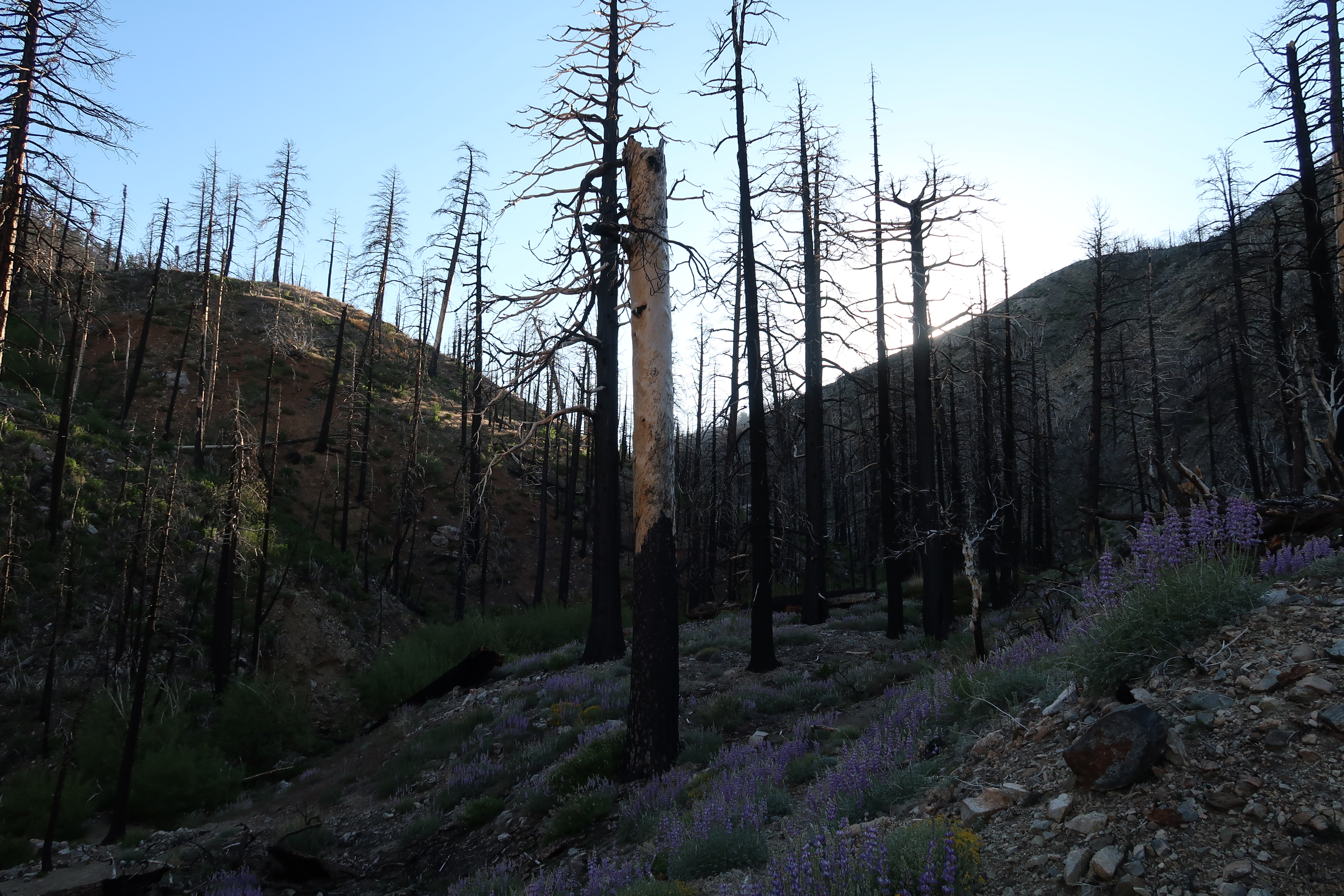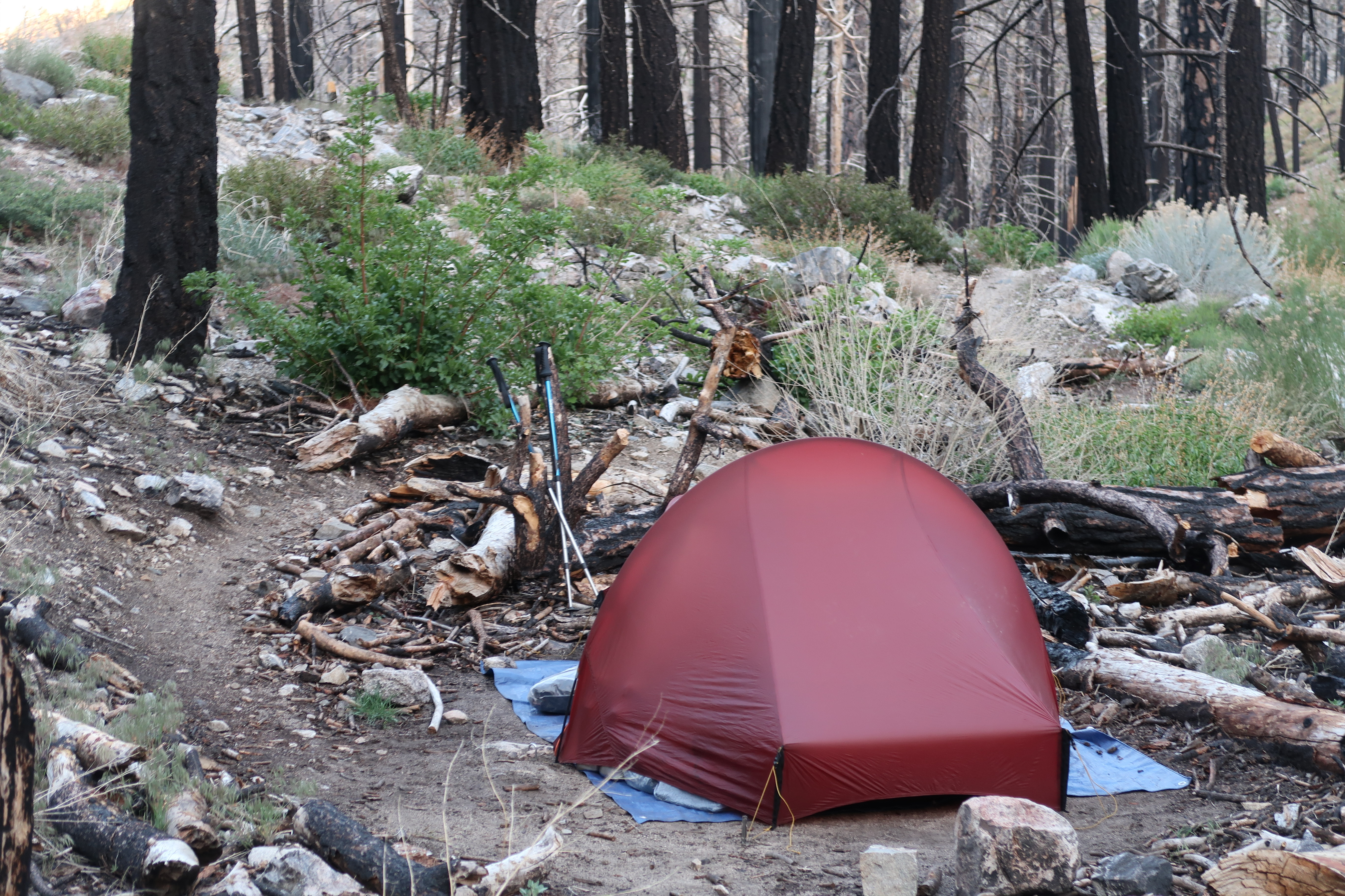 Ich musste notgedrungen mein Zelt in diesem gruseligen Waldbrandgebiet aufschlagen, da ich einfach zu fertig war, um noch eine weitere Meile bergauf zu gehen. Ich hatte trotzdem Angst, dass die toten Bäume auf mein Zelt krachen könnten, während ich friedlich schlafen würde. Aber da ihr das hier lest, ist es nicht passiert, also alles gut 🙂