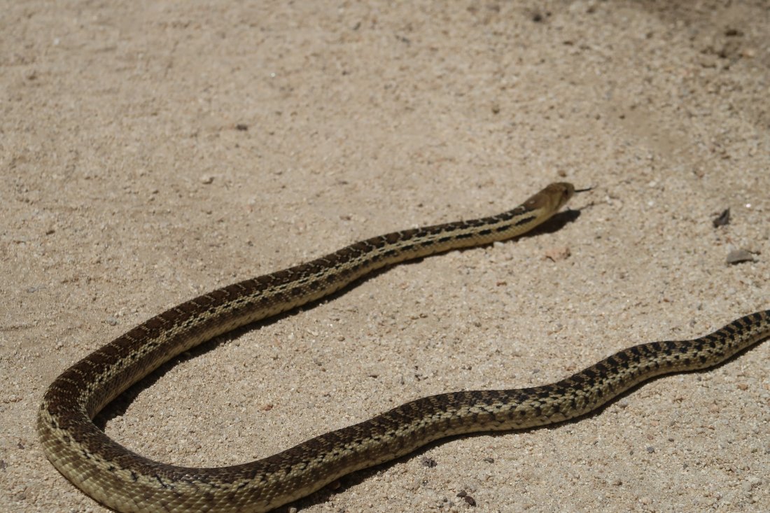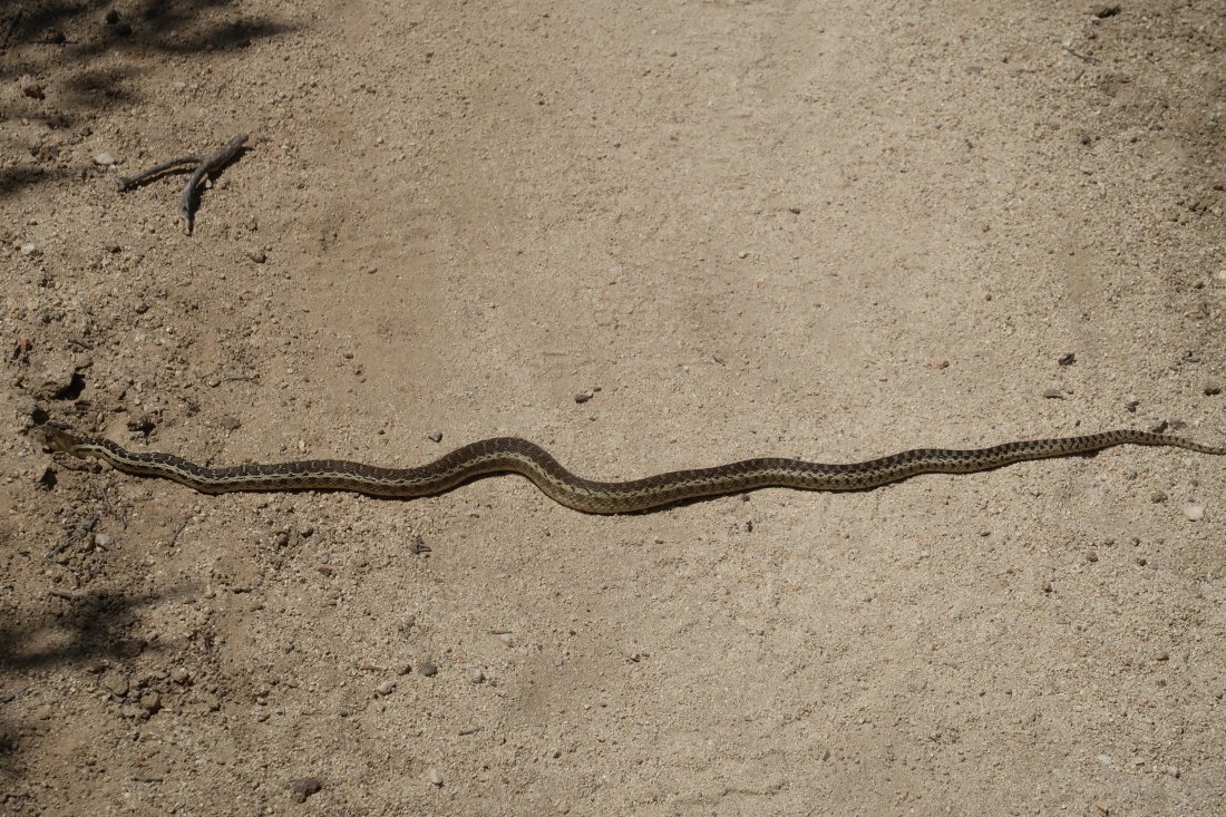 Als wir schließlich weitergingen, ließen wir den schattigen Wald hinter uns und kamen wieder in wüstenartige Gefilde. Da lag mal wieder eine Schlange vor uns auf dem Trail, dieses Mal eine ungiftige, dennoch war sie recht groß und schön anzusehen. Wir blieben einen Moment vor ihr stehen und beobachteten fasziniert, wie sie sich bewegte und langsam in die Büsche kroch. Schlangen gehören zu meinen Lieblingstieren hier draußen.
