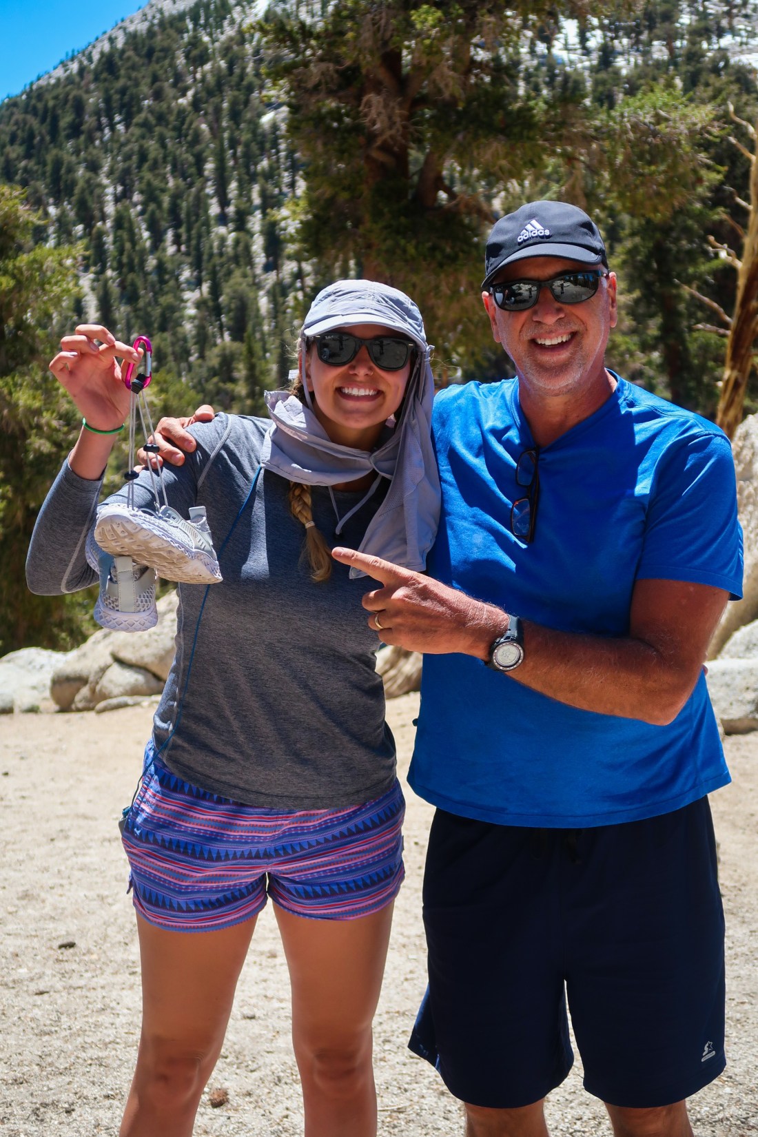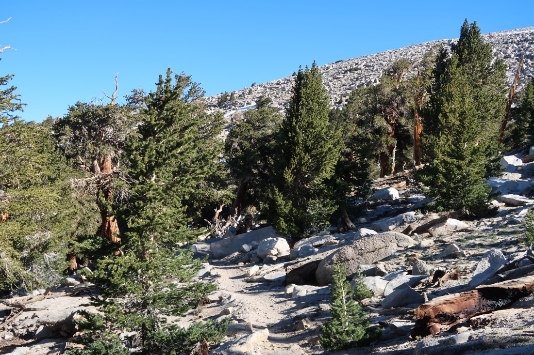 Auf der anderen Seite ging es steil aufwärts. Nach einer gewissen Weile traf ich eine Gruppe Wanderer, die den John Muir Trail (JMT) wanderten. Dieser Trail ist die meiste Zeit über identisch mit dem PCT, jedoch spaltet er sich manchmal ab. Außerdem ist er nur auf die Sierra Nevada beschränkt. Ich fragte die Leute, ob jemand von ihnen diese Schuhe vermisste. Sie riefen mir zu, dass vor zehn Minuten eine junge Frau mit ihrem Vater vorbeikamen, die ein Paar vermissten. Daher entschied ich mich dazu meine Mittagspause zu verschieben und weiterzuwandern. Nach etwa einer halben Stunde, als der Trail wieder eine extreme Steigung annahm, die mich körperlich ziemlich auslaugte, holte ich die Zwei ein. Die junge Frau konnte es kaum fassen und stand nur mit offenem Mund da, während sie mich ungläubig betrachtete. Da musste ich wirklich schmunzeln. 🙂