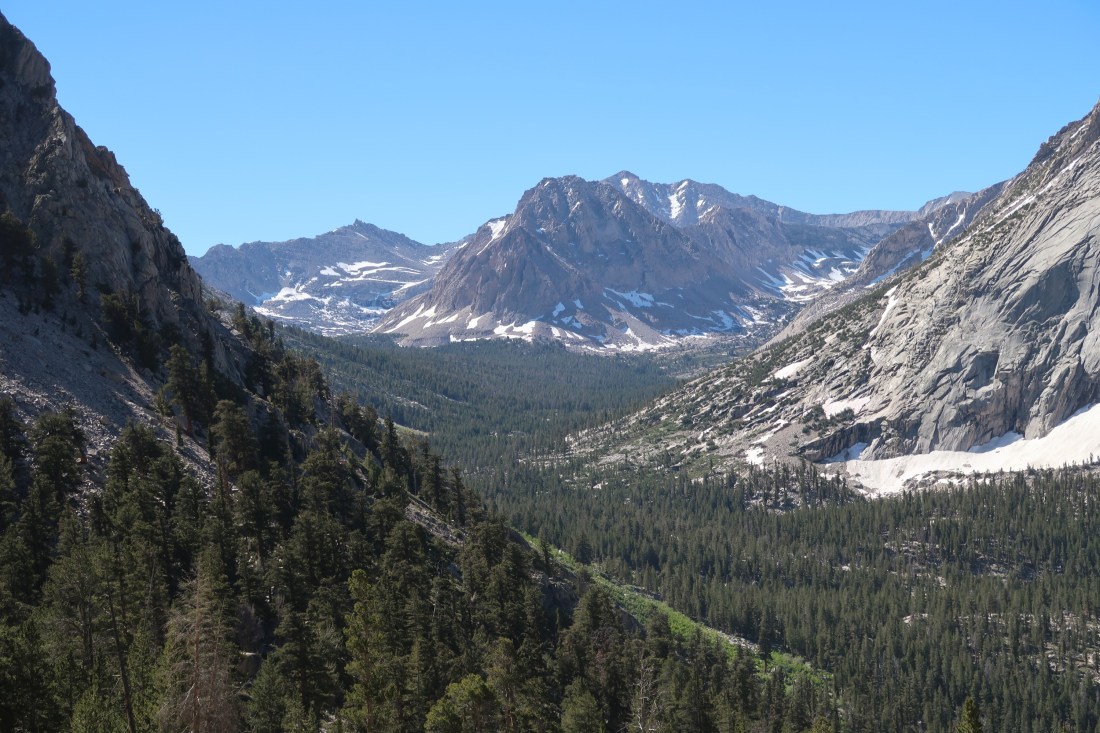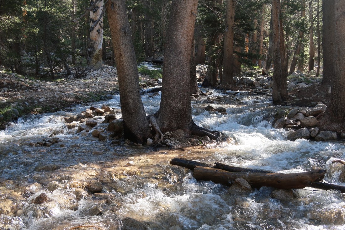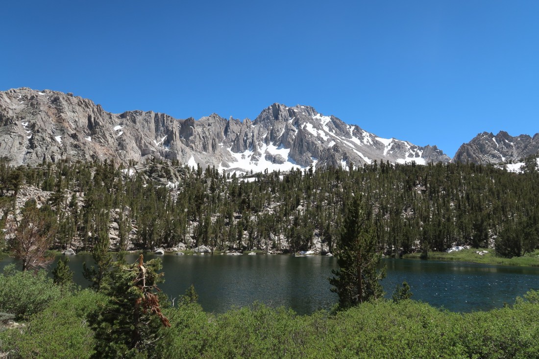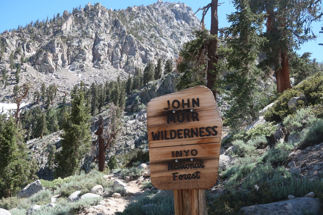 Heute wollten ich und Trouble nach Bishop um uns auszuruhen und einzukaufen. Dazu mussten wir jedoch ersteinmal aus den Bergen herauskommen, was kein leichtes Unterfangen war, denn es gab keine asphaltierten Straßen in der Nähe. Doch es gab einen Weg, den Bullfrog Lake Trail, der über den Kearsarge Pass zu einem Parkplatz raus aus den Sierras führte. Also machten wir uns auf.