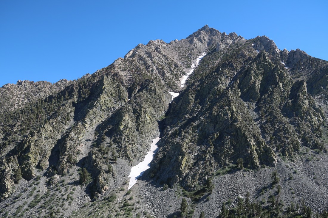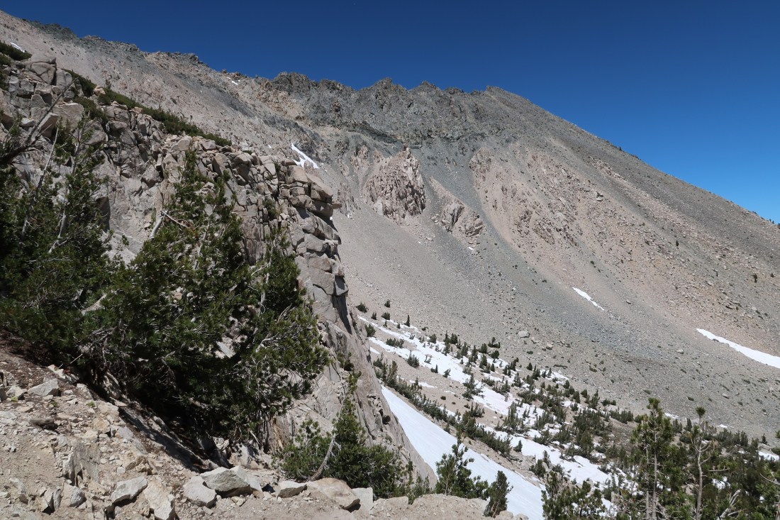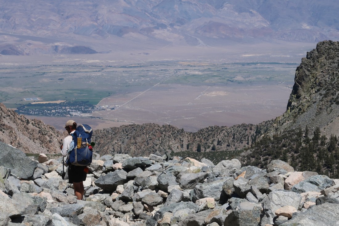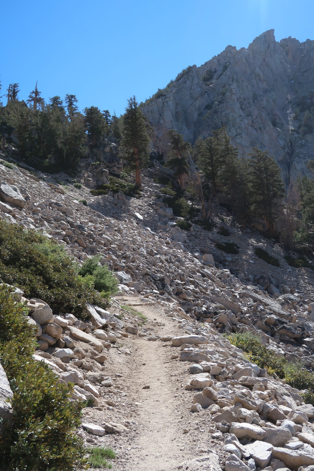 Heute wollten ich und Trouble nach Bishop um uns auszuruhen und einzukaufen. Dazu mussten wir jedoch ersteinmal aus den Bergen herauskommen, was kein leichtes Unterfangen war, denn es gab keine asphaltierten Straßen in der Nähe. Doch es gab einen Weg, den Bullfrog Lake Trail, der über den Kearsarge Pass zu einem Parkplatz raus aus den Sierras führte. Also machten wir uns auf.