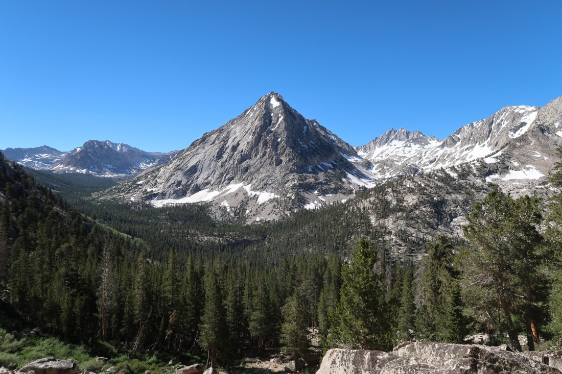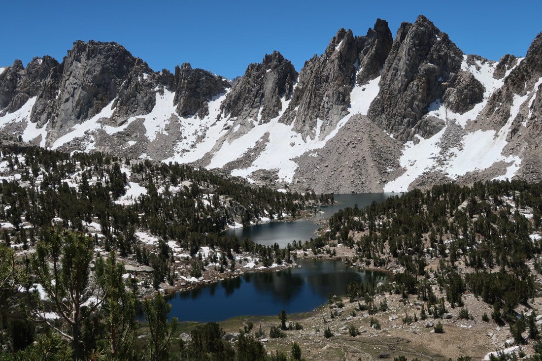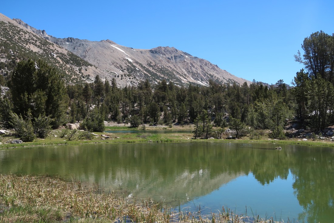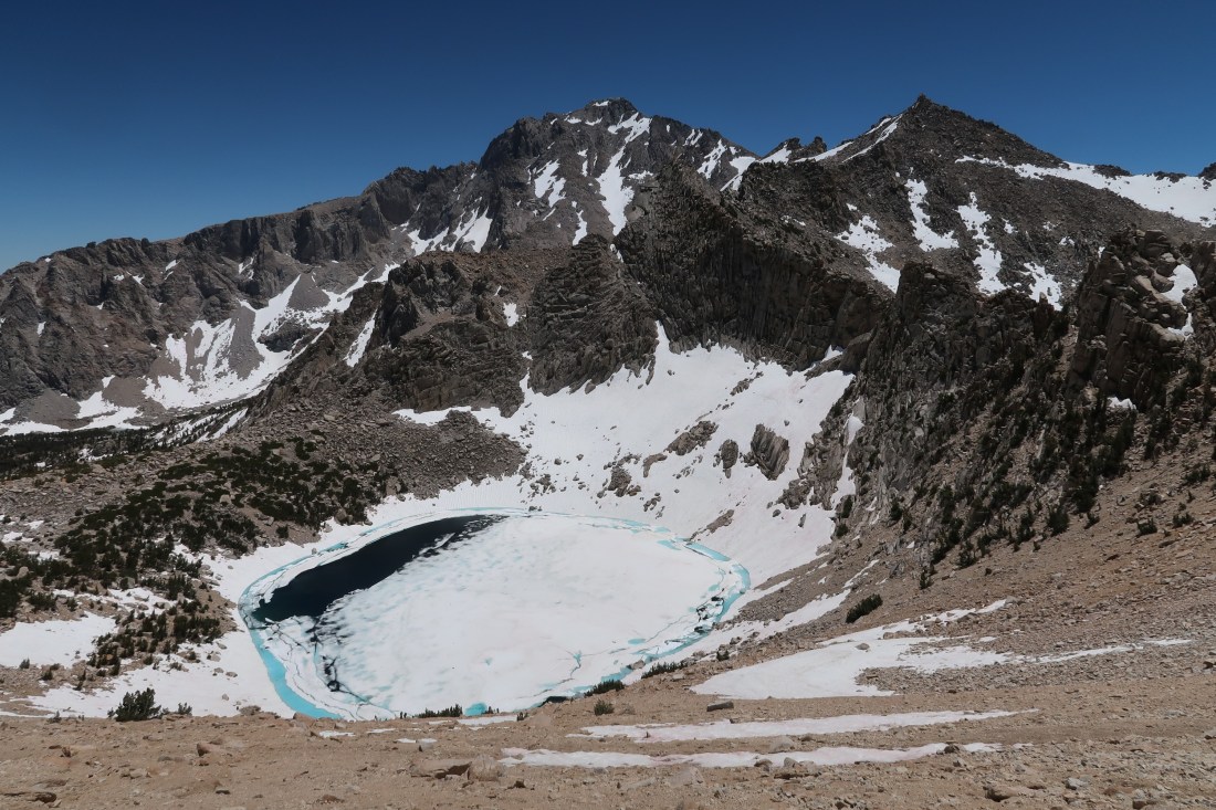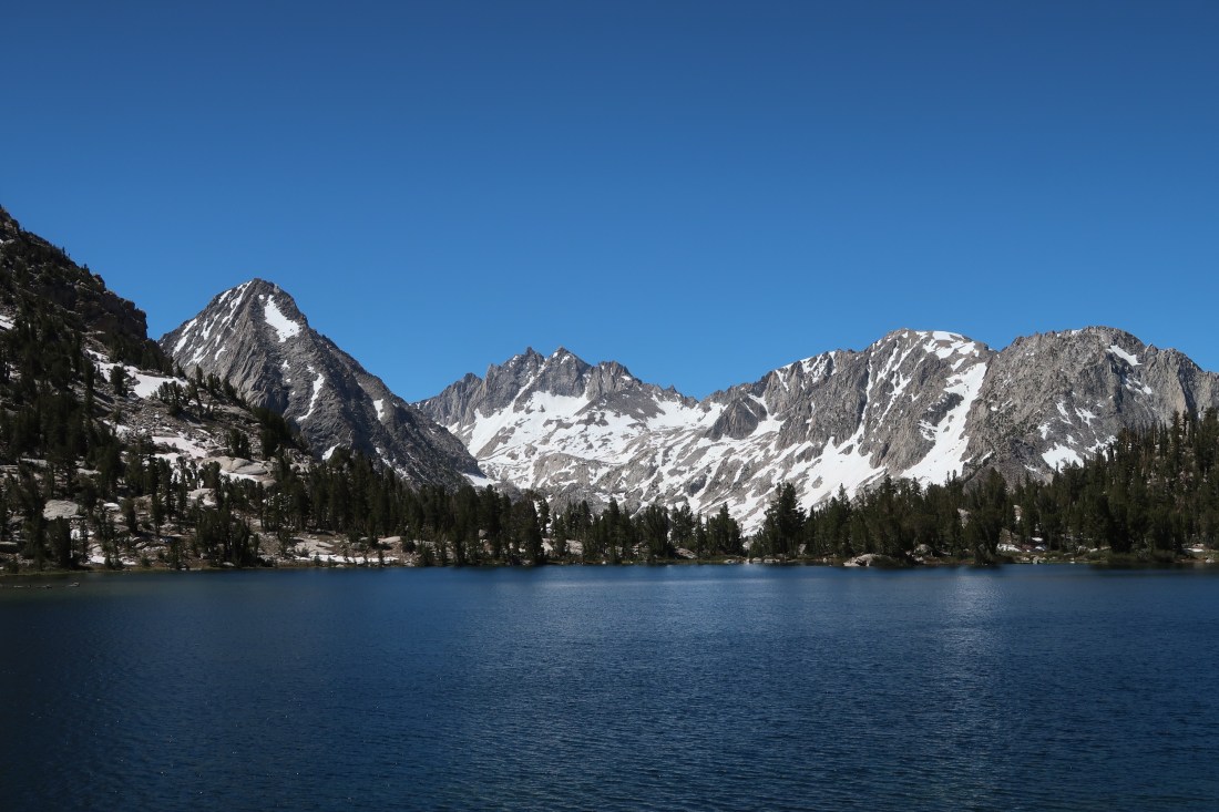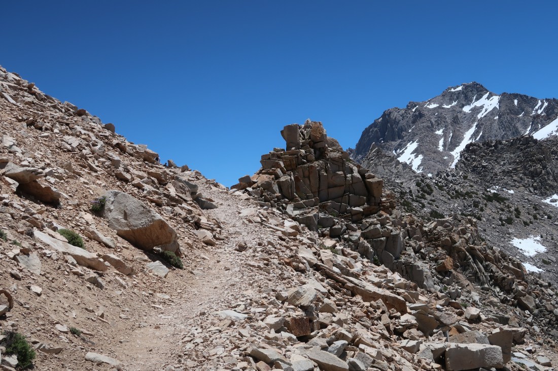 Auf dem Bullfrog Lake Trail passierten wir wunderschöne Bergseen, die in der Sonne glitzerten. Die Landschaft war schöner als ich es erwartete und die mich umringenden Berge und Seen machten den Umweg um ein Vielfaches wieder wett. Trotzdem war der Weg rauf auf den Kearsarge Pass alles andere als einfach. Es wurde gegen Ende so steil, dass mir die Beine brannten und das Atmen zur Tortur wurde. Es waren viele Tageswanderer und junge Pfadfindergruppen unterwegs. Auf dem Pass angekommen unterhielten wir uns mit einer jungen Frau, die noch auf ihren Vater wartete. Sie hatte bereits alle drei großen Wanderungen in den USA gemacht. Den PCT, den CDT und den AT. Das machte sie zum Triple Crowner – also drei Kronen für drei Fernwanderwege. Ich fand das mega beeindruckend.