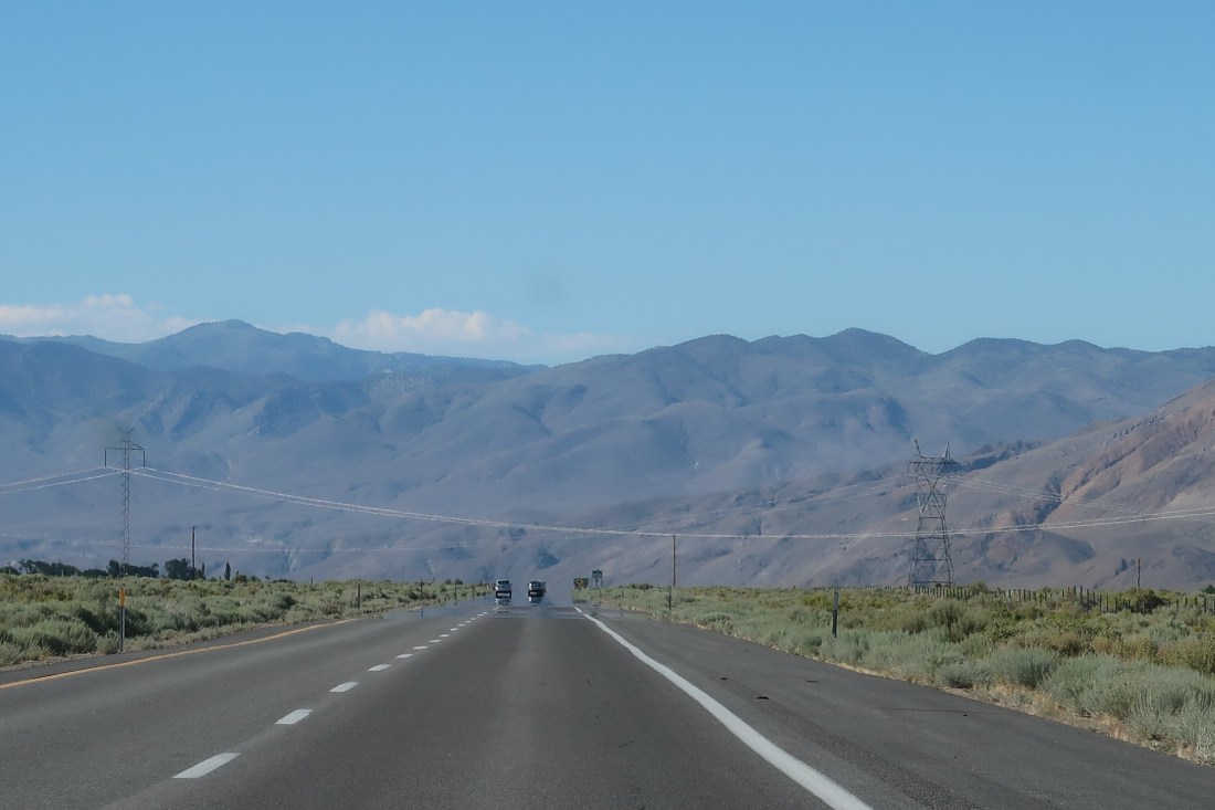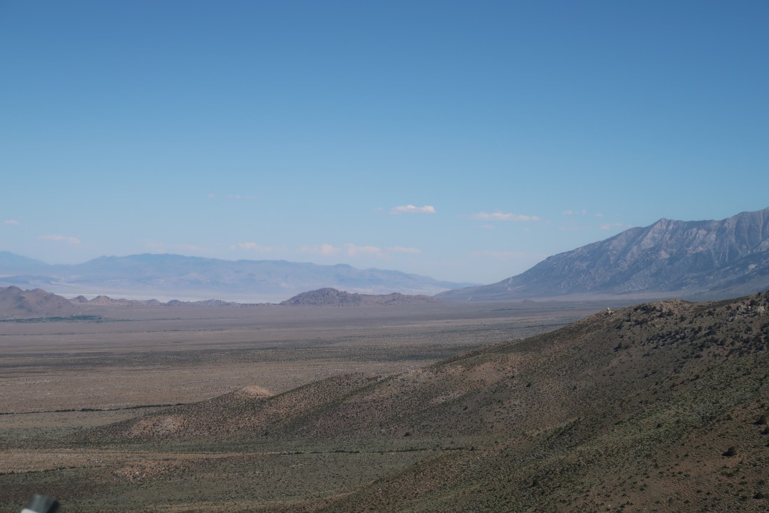 Der Abstieg gestaltete sich problemlos und wir waren rasend schnell an einem Parkplatz. Etwa zwanzig Minuten später kam ein Tageswanderer den Pass herunter und ging zu seinem Wagen. Wir fragten ihn, ob er uns in die nächste Stadt mitnehmen könne und das tat er auch. Im Auto unterhielten wir uns etwas. Er arbeitete als Physiker und Chemiker in irgendeiner Branche. Sehr interessant. Wir verließen die hohen Berge und fuhren in die Wüste hinunter. Ich staunte über den krassen Übergang und die Temperaturen stiegen auf knappe vierzig Grad an. Während hier unten die Wüstensonne brannte, konnte man schneebedeckte Gipfel sehen. Was für ein Kontrast! Er ließ uns an einer Tankstelle in Independence, einem kleinen Kaff mitten im Nirgendwo, heraus. Von dort versuchten wir in der Hitze an der großen Straße nach Bishop zu trampen. Ich besorgte mir vorher aus dem Tankstellenladen kühles Kokosnusswasser und ein paar Bananen.