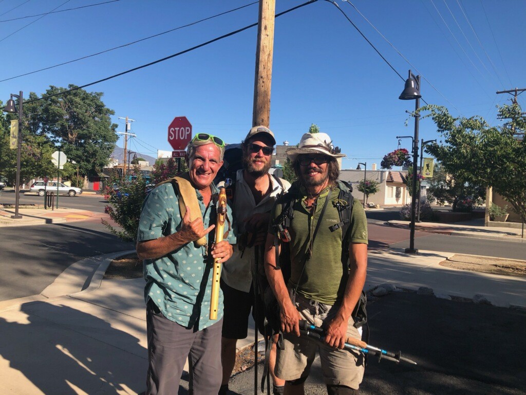 Sie ließen uns an dem sogenannten „Hostel California“ aussteigen, einer sehr hikerfreundlichen Unterkunft. Als Abschied spielte uns Medicine Man ein Stück auf seiner native american flute vor (Flöte nach der Machart amerikanischer Ureinwohner). Es klang sehr idyllisch und rein. Dann verabschiedeten wir uns und machten ein Foto.