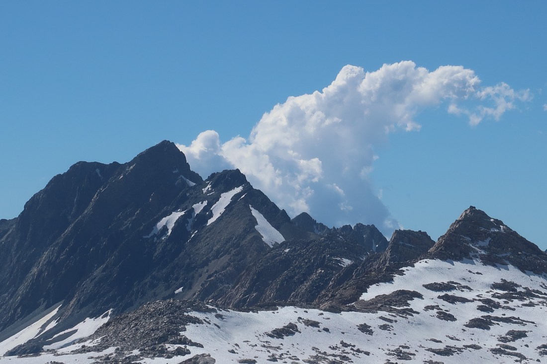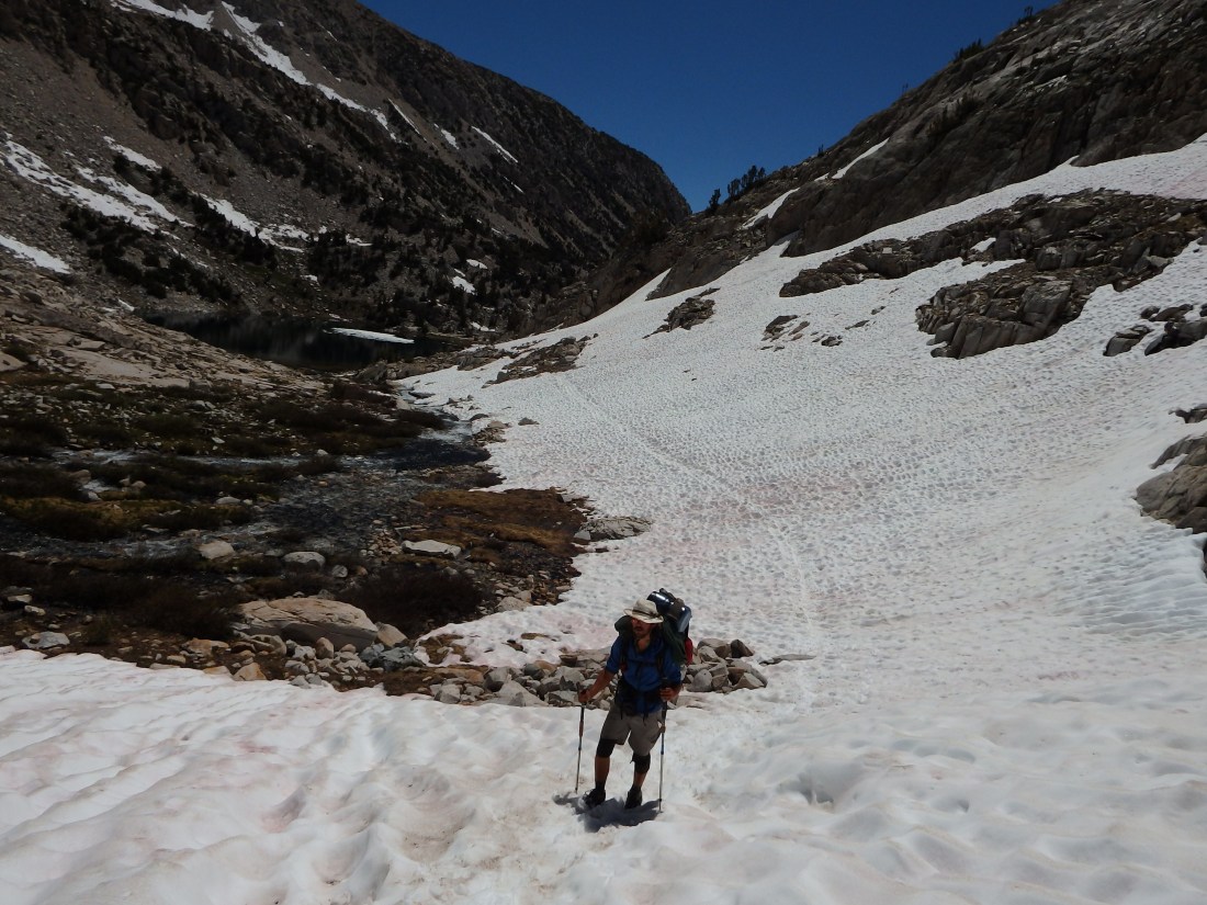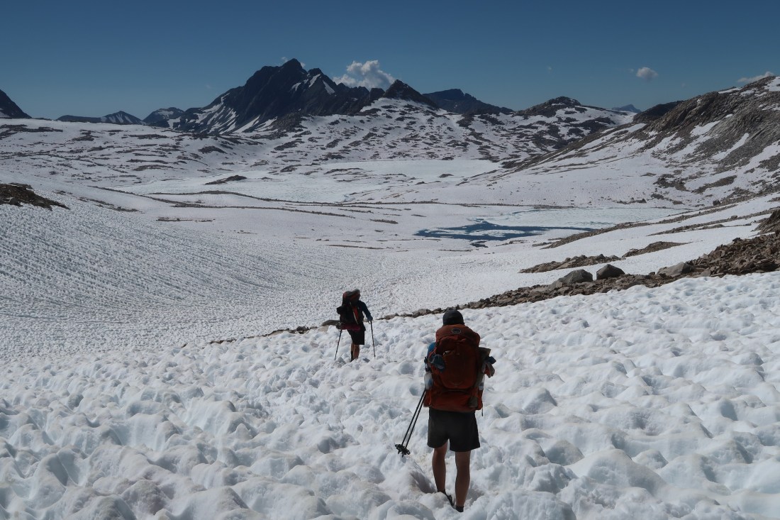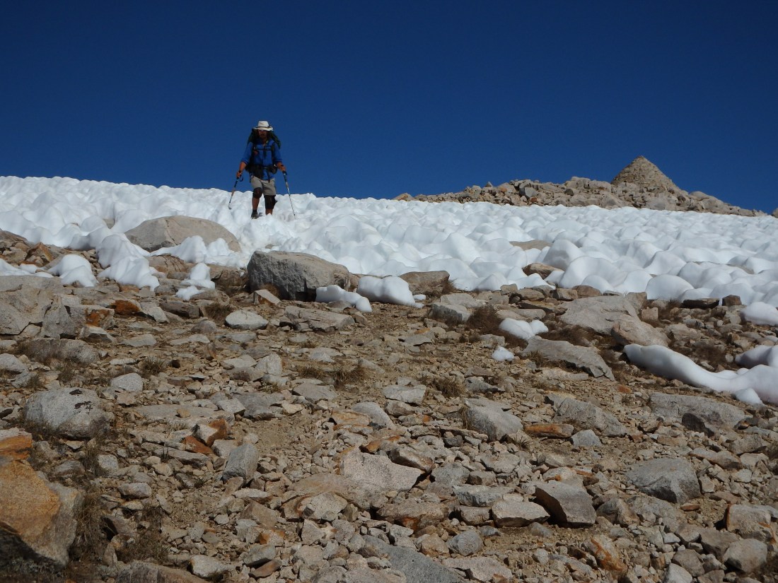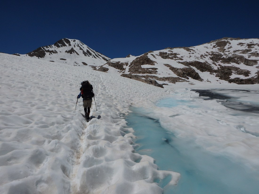 Nach dem Mittagessen legte ich mich für eine halbe Stunde aufs Ohr. Ich konnte einfach nicht anders. Das schien jedoch Wunder zu bewirken. Kurz danach machten wir drei uns auf, einen geeigneten Zeltplatz unterhalb des Schnees zu finden, denn diesen wollten wir um jeden Preis heute hinter uns lassen. Der Abstieg war mehr nervig als anstrengend. In dem von der Sonne aufgeweichten Schnee sanken wir immer wieder ein. Ab und zu kamen gefährlich aussehende Schneebrücken, die sich über Schmelzwasserströmen befanden. Dort musste ich höllisch aufpassen.