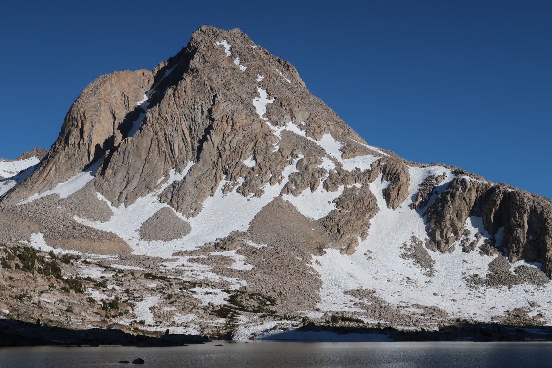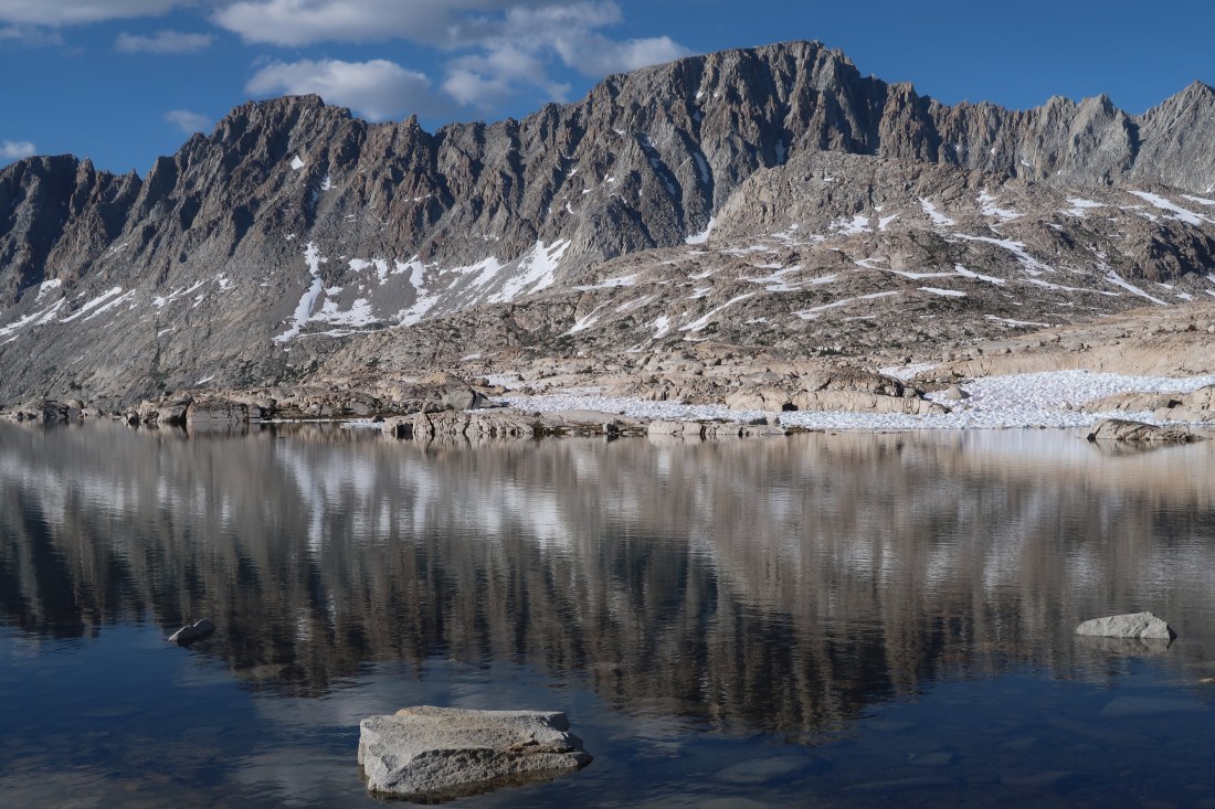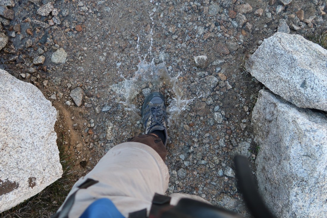 Irgendwann erreichten wir einen trockenen Platz an einem wunderschönen Bergsee mit Blick auf den Muir Pass. Kurz davor lief ich über einen glatten Stein und rutschte aus. Mein Rucksack dämpfte zum Glück meinen Aufprall. Wir hatten vor, den morgigen Tag etwas langsamer anzugehen. Wir waren alle mehr als kaputt und brauchten dringend Schlaf.