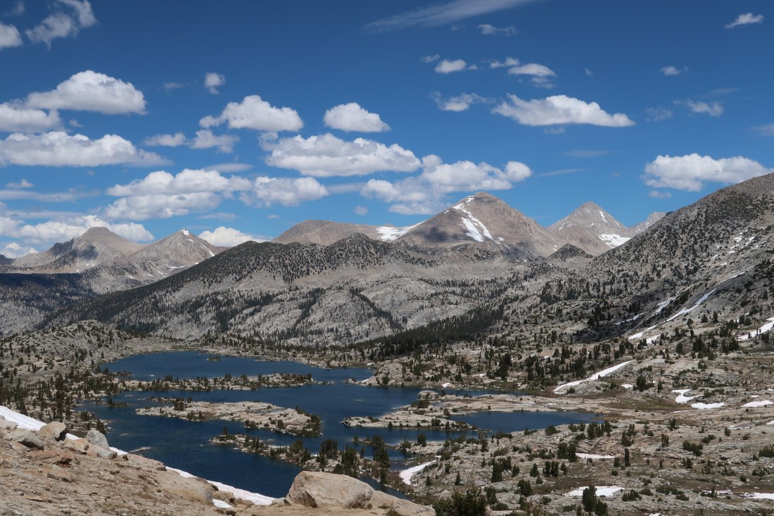 Die Szenerie, die uns oben erwartete, war spektakulär. Man konnte auf beiden Seiten viele stahlblaue Seen, welche von Bergen gesäumt waren, bewundern. Die Nordseite gefiel mir am besten. Das Bild wurde nur noch durch die Schönwetterwolken abgerundet, die über der Bergkette schwebten (zweites Bild).