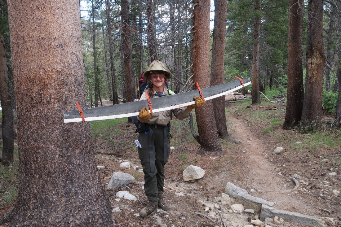 Etwas später kontrollierte uns ein Ranger auf unsere Papiere. Er hatte eine große Karte ausgebreitet und fragte uns nach umgestürzten Bäumen, die den Trail blockierten. Tatsächlich hatten wir am Tag zuvor unter zwei dicken Stämmen kriechen müssen. Diese Informationen gaben wir bereitwillig weiter. Kurz darauf liefen wir an einem Trupp Freiwilliger vorbei. Eine Frau trug eine Säge, die in ihrer Länge schon fast gruselig aussah. Kettensägen waren hier nämlich nicht erlaubt.