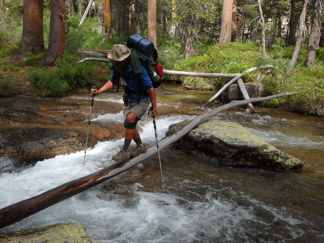 Wir gelangten an den Bear Creek. Diesen konnten wir etwas abseits des Trails auf einem massiven Baumstamm überqueren. Die unzähligen Mücken verdarben mir sabei den Spaß an der Sache. Ich war nur froh, dass ich ein Mückennetz über dem Kopf trug. Zero hingegen verschluckte ab und zu mal einen Moskito. Wir gelangten an einen Nebenarm des Bear Creek (eher ein Zulauf). Ich glaubte schon, dass ich diesen nicht hätte überqueren können, ohne dabei nass zu werden. Es lag lediglich ein dünner Baum über dem Fluss, der als Brücke dienen könnte. Doch ich befürchtet, dass dieser unter der Last zusammenbrechen würde. Dave hingegen wirkte unbekümmert und machte es mir vor. Dabei schwankte er stark von einer auf die andere Seite, ohne jedoch zu fallen. Während Zero einfach seine Schuhe nass machte, tat ich es Dave gleich. Meine Idee, die Treckingstöcke auf die größtmögliche Länge auszufahren, war mehr als gut. Ich überquerte den Fluss fast schon sicher.
