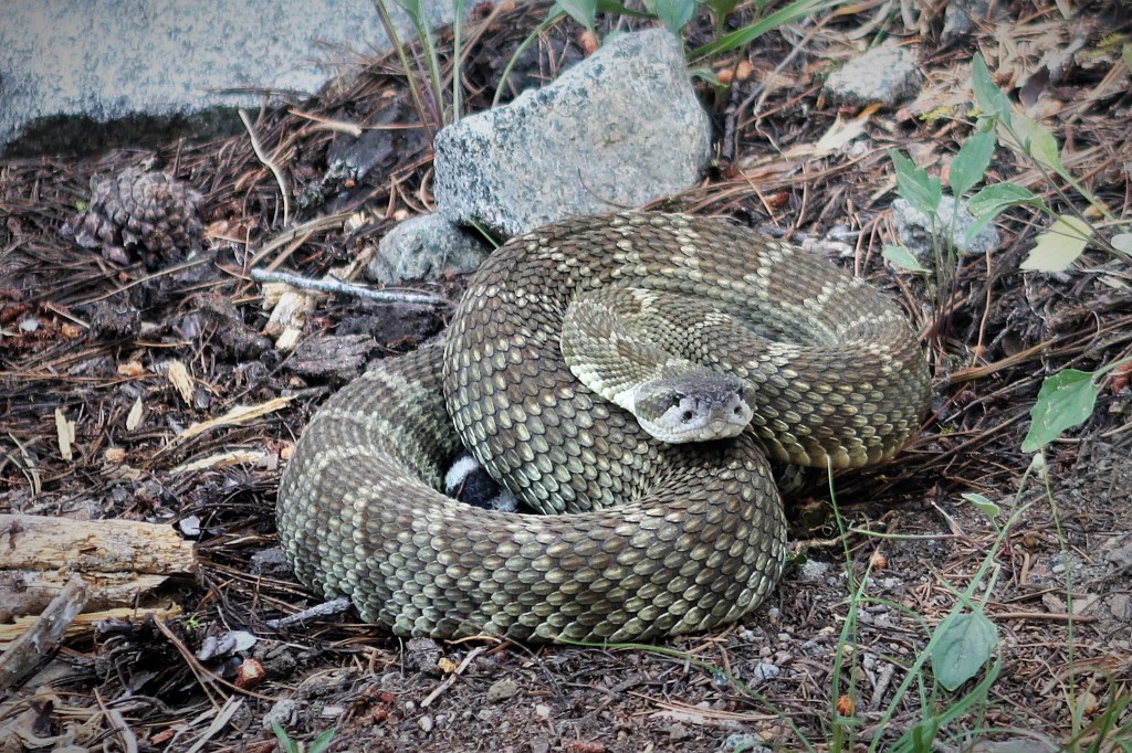 Kurz vor meinem geplanten Mittag überquerte ich eine Piste. Eigentlich nicht der Rede wert und ich hätte es auch unerwähnt gelassen, wenn ich nicht eine unerwartete Begegnung mit einem alten Bekannten gehabt hätte. Ich dachte, dass ich mit der Wüste auch alle Klapperschlangen hinter mir gelassen hätte. Doch dem war nicht so. Ich bemerkte sie zunächst nicht, da ich mich auf ein Schild konzentrierte. Dennoch nahm ich am Rande ihr Rasseln wahr, dass sie zur Warnung erzeugte. Doch in meinem Unterbewussten musste ich dieses Geräusch wohl mit dem einer Grille verwechselt haben. Es gab hier Dutzende von denen. Dann durchfuhr es mich wie ein Blitz, als ich mir der Situation plötzlich bewusst wurde. Das große Tier ließ mich keine Sekunde aus den Augen, während es sich schützend zusammenrollte. Als der Schock überwunden war, staunte ich über die Art, wie die Haut gemustert war. Ein schönes Tier, aber auch bedrohlich.
