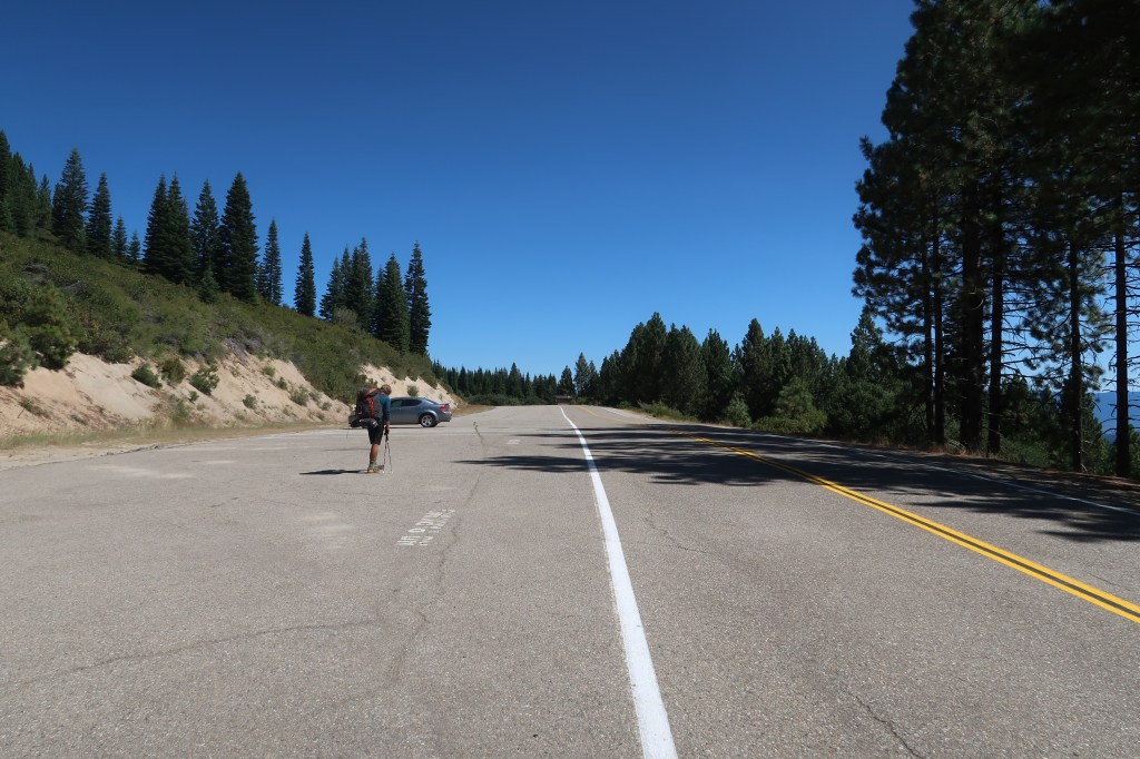 Doch dann erreichten wir nach acht Meilen eine asphaltierte Straße, die uns nach Bucks Lake bringen könnte. Dort wollten wir uns etwas umsehen und eventuell zu Mittag essen. Eine ältere Dame nahm uns mit zu dem zehn Einwohner zählenden Resort. Es gab ein Restaurant und ich bestellte mir Pommes mit einer veganen Pizza (heißt also Pizza ohne Käse). Dann aß ich mich so voll, dass ich Mühe hatte zu gehen, während sich mein Bauch nach vorn wölbte. Zero wollte sich noch etwas ausruhen und später am Abend zu mir stoßen. Und so trampte ich allein zurück zum Trail.