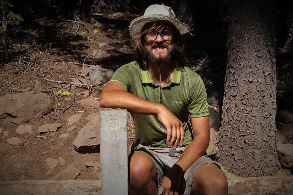 Nichtsdestotrotz hatte ich ja noch ein paar Stunden, um meinem Hörbuch zu lauschen. Das lenkte mich etwas ab. Der Trail, der sich anscheinend unsterblich in den Wald verliebt hatte, führte umringt von Bäumen weiter und weiter aufwärts. Unterwegs sah ich ein Wespennest, dass an einem Stamm festklebte. Die Tiere waren friedfertig und ich konnte ihnen fasziniert bei ihrer Arbeit zuschauen. Und etwas später kam der große Moment. Der Mittelpunkt des Trails: der ‚PCT Midpoint‘ war erreicht. Dort stand sogar ein kleines Monument. 1325 Meilen lagen bereits hinter mir, mehr als 2000 Kilometer Wildnis. Wahnsinn! Das hatte seine Spuren hinterlassen. Nachdem ich mir eines der Bilder ansah, die Honeybuns von mir und dem Monument gemacht hatte, musste ich erst einmal schlucken. Die Person dort auf dem Foto sah aus, als wäre sie für geraume Zeit im Wald verloren gegangen. Langer, wilder Bart, noch längere etwas verfilzte Haare, dunkelbraune Haut und staubige Beine. Ein waschechter ungewaschener Fernwanderer. Nein, Abenteurer! Zur Feier des Tages (und weil mein Magen es so wollte) machte ich mir noch ein paar Spaghetti. Dazu gab es Salz, also eine sehr nahrhafte Mahlzeit. 😉