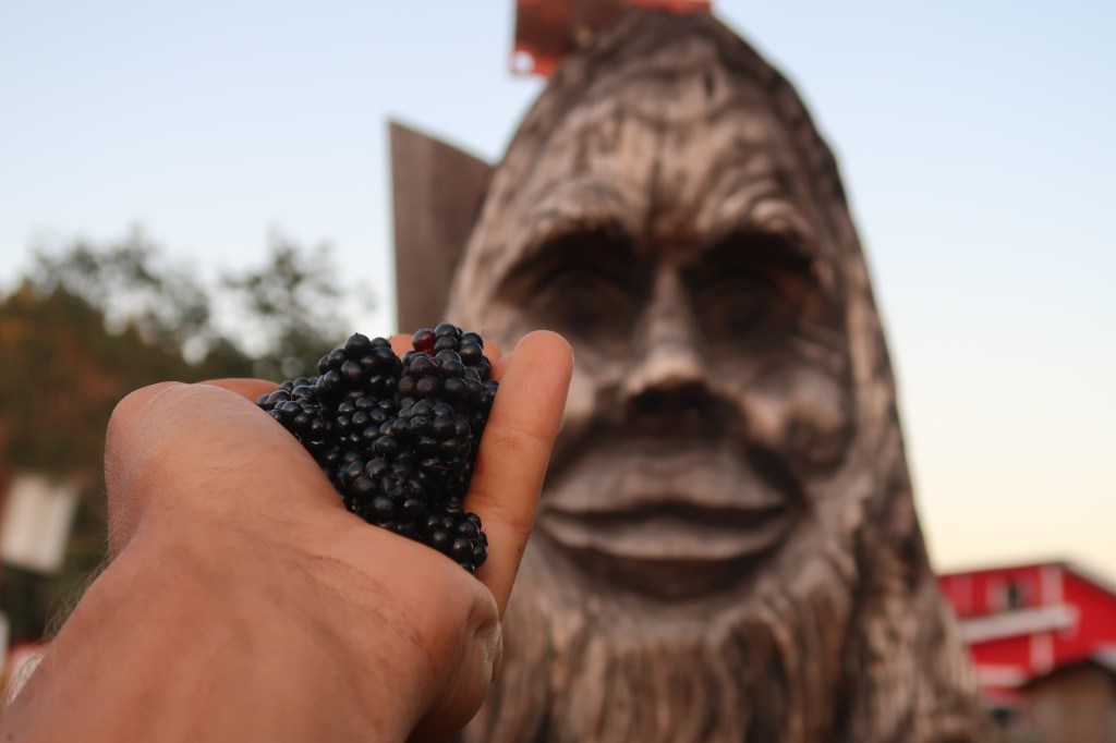 Gegen Abend machten wir eine kurze Rast. Ich fand einen Strauch mit reifen Brombeeren und erntete ein paar. Ein hölzernes Wesen beobachtete mich dabei. Aus Demut und Respekt opferte ich einen Teil meiner Ernte. Achthundert Kilometer Fußweg durch einige der schönsten Regionen Amerikas lagen noch vor mir.