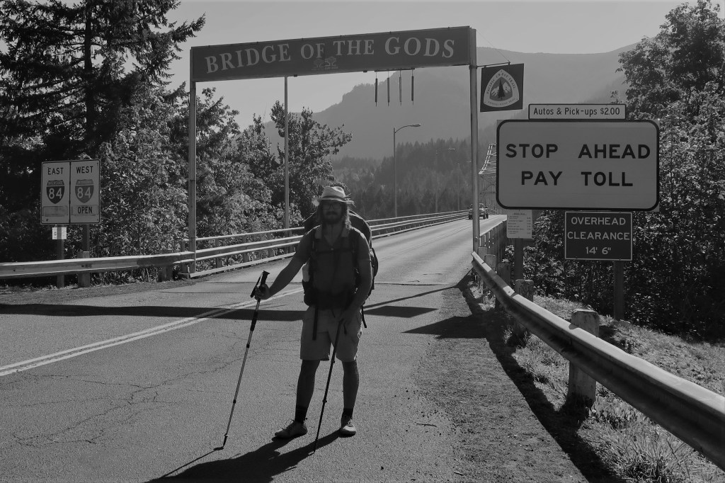 Die Temperatur lag morgens im absoluten Wohlfühlbereich. Das konnte an der Höhe liegen, die gerade einmal fünfzig Meter über dem Meeresspiegel betrug. Ich ging gleich als Erstes duschen. Leider konnte man die Temperatur nicht einstellen und so war ich gezwungen mich warm zu waschen, was an sich auch nicht weiter schlimm war. Für fünf Dollar die Nacht ein sehr faires Angebot. Zero brauchte länger als ich. Viel länger, denn als ich schon gefrühstückt und meine Sachen gepackt hatte, saß er noch müde auf der Bank. Ich verabschiedete mich schonmal, denn ich wollte nicht allzu spät loslegen. Nach etwa zehn Minuten sah ich die unter Fernwanderern berühmte Brücke, welche die Staaten Oregon und Washington miteinander verbindet. ‚The Bridge of the Gods‘ (die Brücke der Götter). Eigentlich war das Teil gar nicht so aufregend. Doch sie symbolisierte den Übergang in den letzten Staat des PCT und damit den finalen Abschnitt der Reise.
