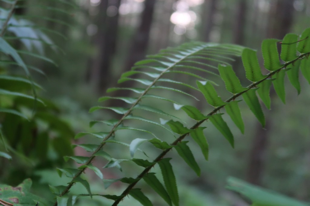 Was mir jetzt schon besonders gefiel, war die üppige Vegetation hier im Wald. Anders als in Nordkalifornien wirkte alles rund um grüner. Als ich die eintausend Höhenmeter überwand, setzte der Wald noch einen drauf. Farne wucherten regelrecht von beiden Seiten über den Trail. Grüne Moose bedeckten die Äste, Zweige und Stämme der Bäume. Überall waren Beerenbüsche zu sehen. Am meisten sah ich die ‚Oregon Grape‘, also blaue Beeren, die eher sauer und leicht bitter schmeckten. Durch meine Recherchen konnte ich allerdings herausfinden, dass sie reich an Vitamin C sind. Also aß ich hier und da eine Handvoll.