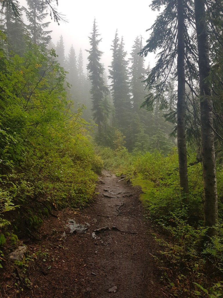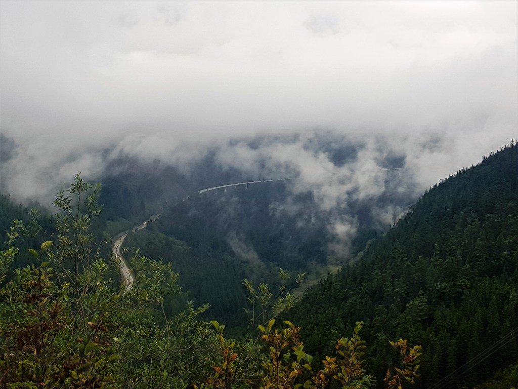 Nach ein paar Meilen eröffnete sich mir mit einem Mal ein Ausblick. Die bewaldeten Hänge verloren sich in einer tiefen Schlucht weit unter mir. Aus der dicken Wolkenschicht lösten sich immer wieder Fetzen. Sie verfingen sich in den Bergen, wo sie wie Dampf emporstiegen. Ich beobachtete die Szene noch ein wenig, bevor ich meinen Weg ins Tal fortsetzte. Es fing langsam zu regnen an.