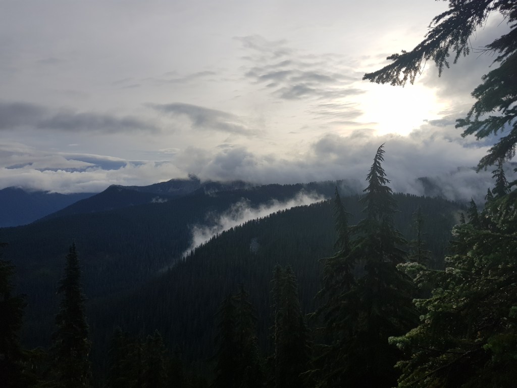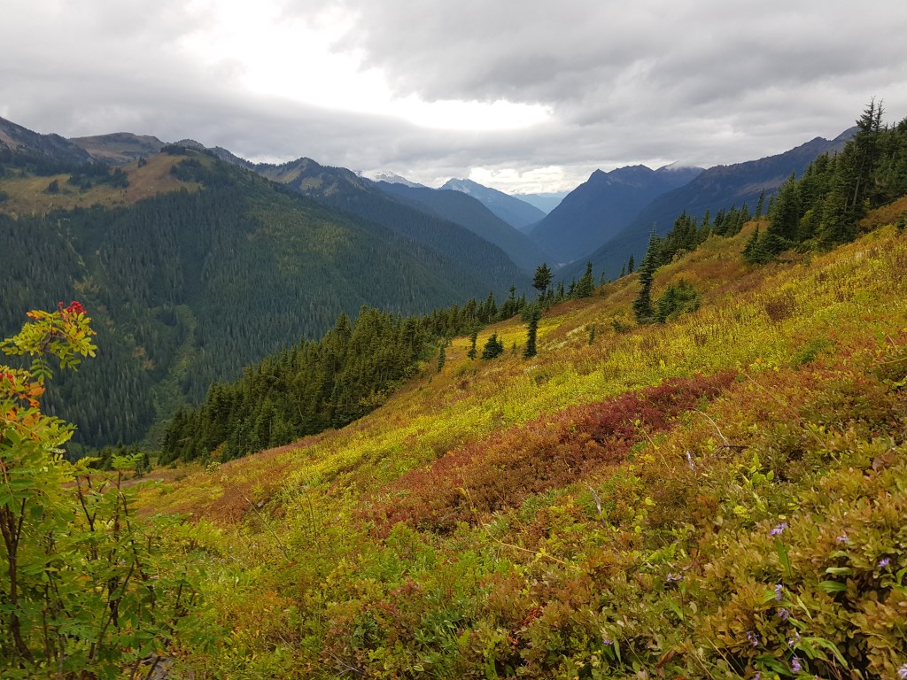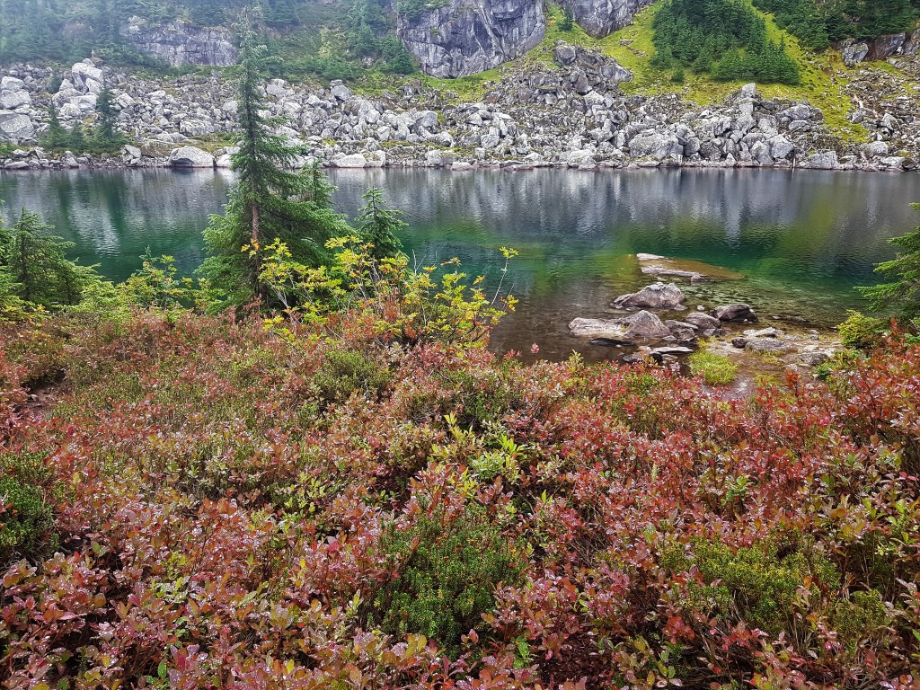 Die unzähligen Beerenbüsche leuchteten in einem kräftigen Rot. Tropfen des Morgentaus lagen wie Glasmurmeln auf den winzigen Blättern. Es gab außerdem wieder eine schiere Unzahl an vollreifen Huckleberries. Leider hatte ich kaum genug Zeit zum Pflücken, denn es lagen noch gut vierzig Kilometer Wegstrecke vor mir.